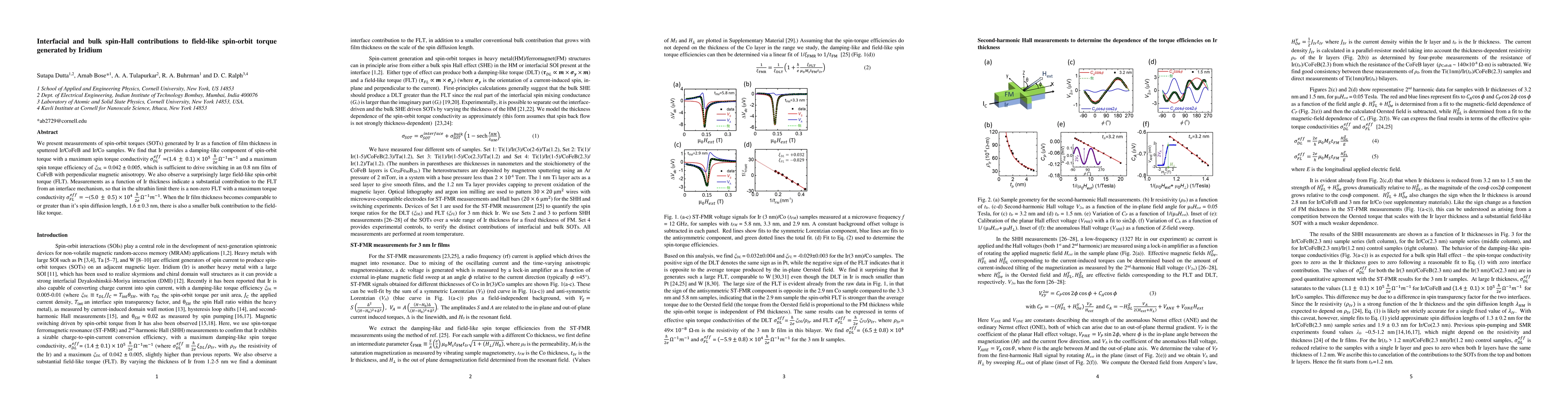 This study investigates spin-orbit torques generated by Iridium in Ir/CoFeB and Ir/Co samples, revealing both damping-like and field-like components. The interface mechanism significantly contributes to the field-like torque, especially in ultrathin films, while bulk contributions become notable when Ir thickness exceeds its spin diffusion length.