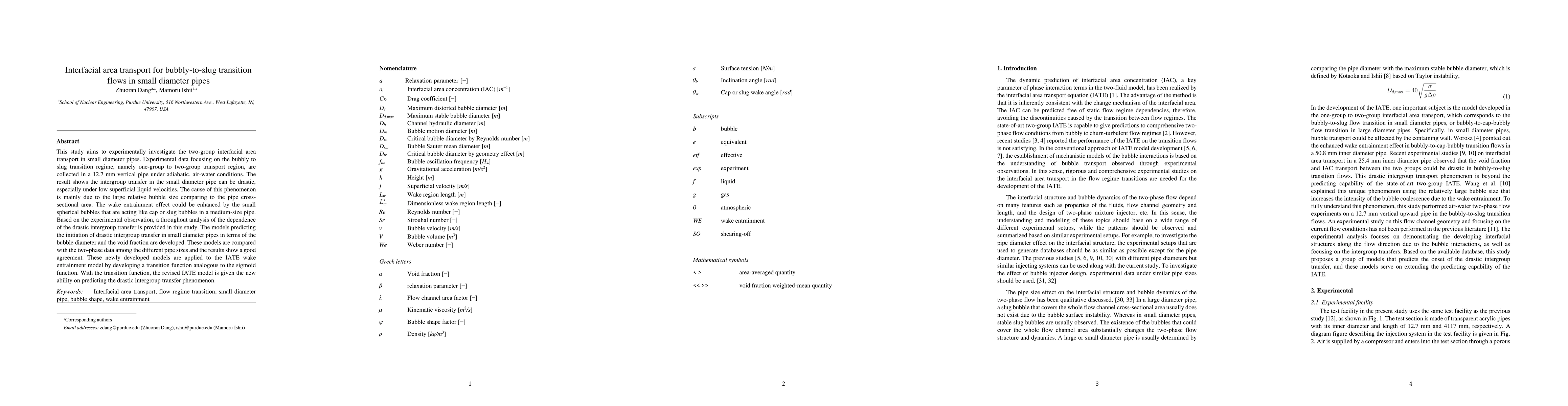 This study aims to experimentally investigate the two-group interfacial area transport in small diameter pipes. Experimental data focusing on the bubbly to slug transition regime, namely one-group to two-group transport region, are collected in a 12.7 mm vertical pipe under adiabatic, air-water conditions. The result shows the intergroup transfer in the small diameter pipe can be drastic, especially under low superficial liquid velocities. The cause of this phenomenon is mainly due to the large relative bubble size comparing to the pipe cross-sectional area. The wake entrainment effect could be enhanced by the small spherical bubbles that are acting like cap or slug bubbles in a medium-size pipe. Based on the experimental observation, a throughout analysis of the dependence of the drastic intergroup transfer is provided in this study. The models predicting the initiation of drastic intergroup transfer in small diameter pipes in terms of the bubble diameter and the void fraction are developed. These models are compared with the two-phase data among the different pipe sizes and the results show a good agreement. These newly developed models are applied to the IATE wake entrainment model by developing a transition function analogous to the sigmoid function. With the transition function, the revised IATE model is given the new ability on predicting the drastic intergroup transfer phenomenon.
