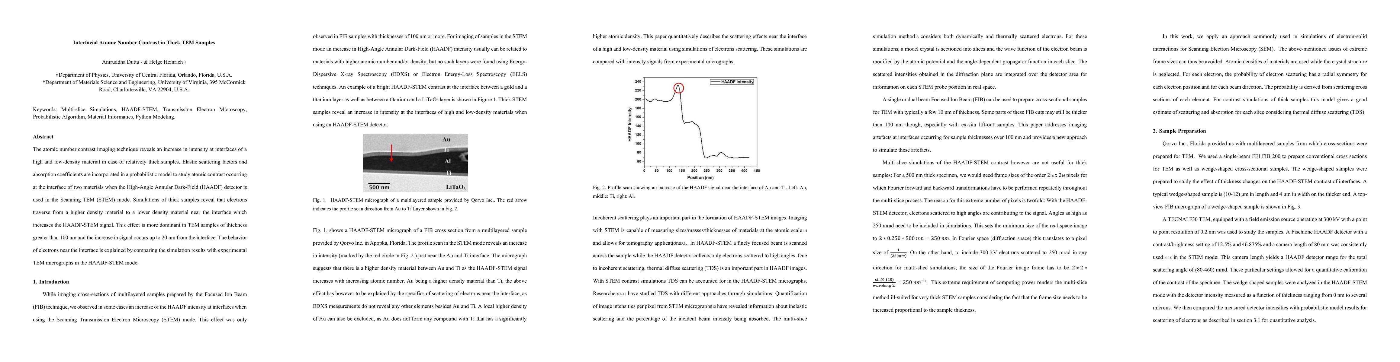 Researchers used TEM to study atomic number contrast in thick samples, finding that electrons from a high-density material increase signal near interfaces with lower-density materials.