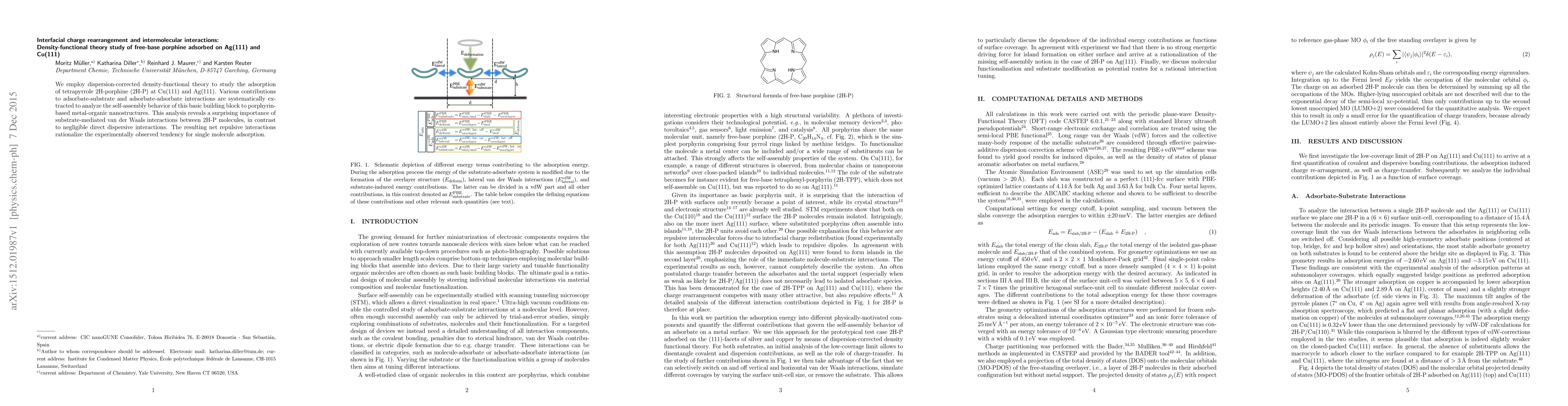 This study employs dispersion-corrected density-functional theory (DFT) to investigate the adsorption of free-base porphine (2H-P) on Ag(111) and Cu(111) surfaces, systematically analyzing various contributions to adsorbate-substrate and adsorbate-adsorbate interactions.