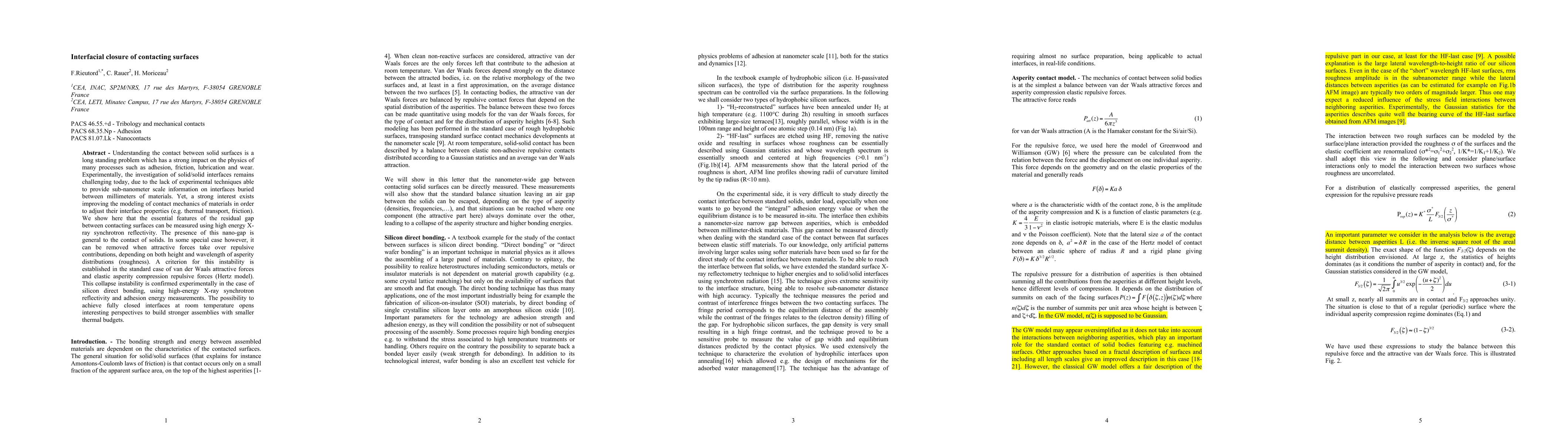 Understanding the contact between solid surfaces is a long standing problem which has a strong impact on the physics of many processes such as adhesion, friction, lubrication and wear. Experimentally, the investigation of solid/solid interfaces remains challenging today, due to the lack of experimental techniques able to provide sub-nanometer scale information on interfaces buried between millimeters of materials. Yet, a strong interest exists improving the modeling of contact mechanics of materials in order to adjust their interface properties (e.g. thermal transport, friction). We show here that the essential features of the residual gap between contacting surfaces can be measured using high energy X-ray synchrotron reflectivity. The presence of this nano-gap is general to the contact of solids. In some special case however, it can be removed when attractive forces take over repulsive contributions, depending on both height and wavelength of asperity distributions (roughness). A criterion for this instability is established in the standard case of van der Waals attractive forces and elastic asperity compression repulsive forces (Hertz model). This collapse instability is confirmed experimentally in the case of silicon direct bonding, using high-energy X-ray synchrotron reflectivity and adhesion energy measurements. The possibility to achieve fully closed interfaces at room temperature opens interesting perspectives to build stronger assemblies with smaller thermal budgets.