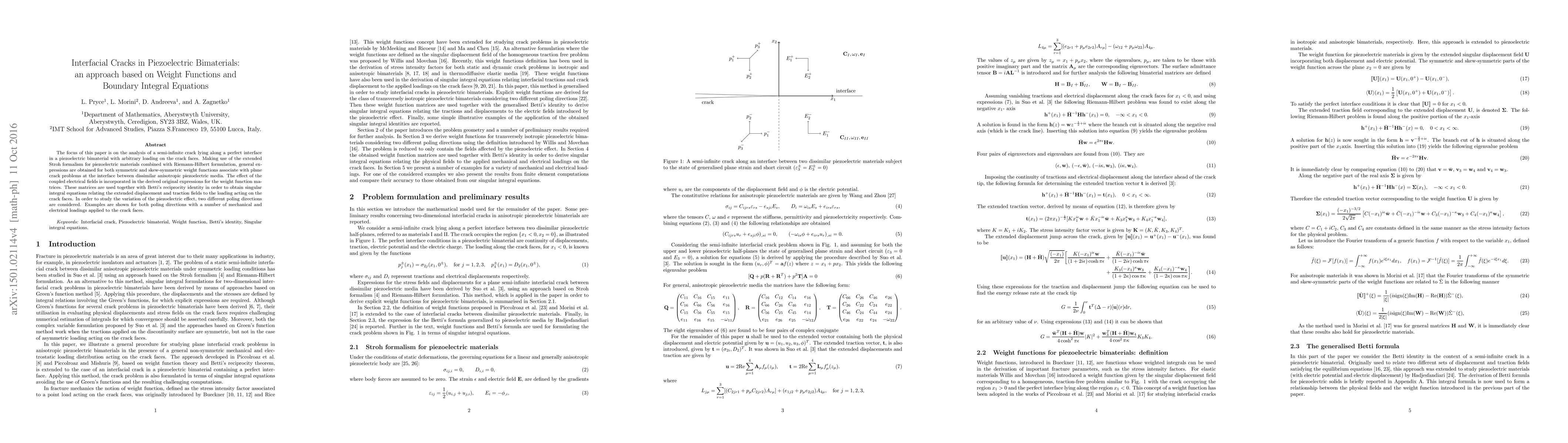 This paper analyzes semi-infinite interfacial cracks in piezoelectric bimaterials using extended Stroh formalism and Riemann-Hilbert formulation to derive weight function matrices. These matrices are employed to obtain singular integral equations for the displacement and traction fields, considering the effects of coupled electrical fields and different poling directions.