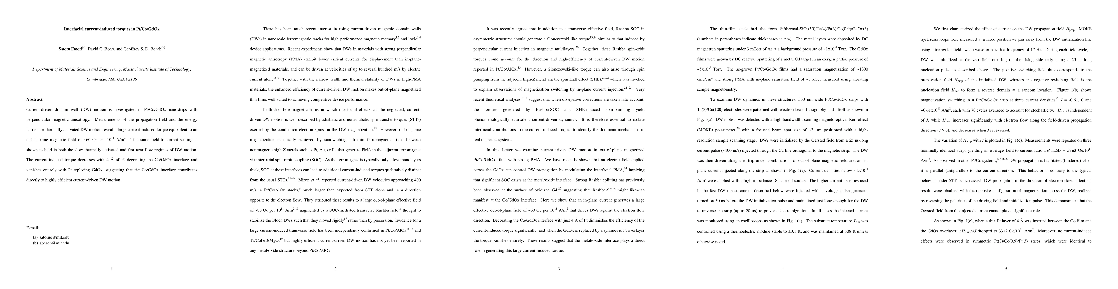 This study investigates current-driven domain wall motion in Pt/Co/GdOx nanostrips, revealing a significant current-induced torque equivalent to an out-of-plane magnetic field of ~60 Oe per 10^11 A/m^2, which persists across different DW motion regimes. The torque diminishes with Pt decoration at the Co/GdOx interface, indicating the interface's role in efficient current-driven domain wall motion.