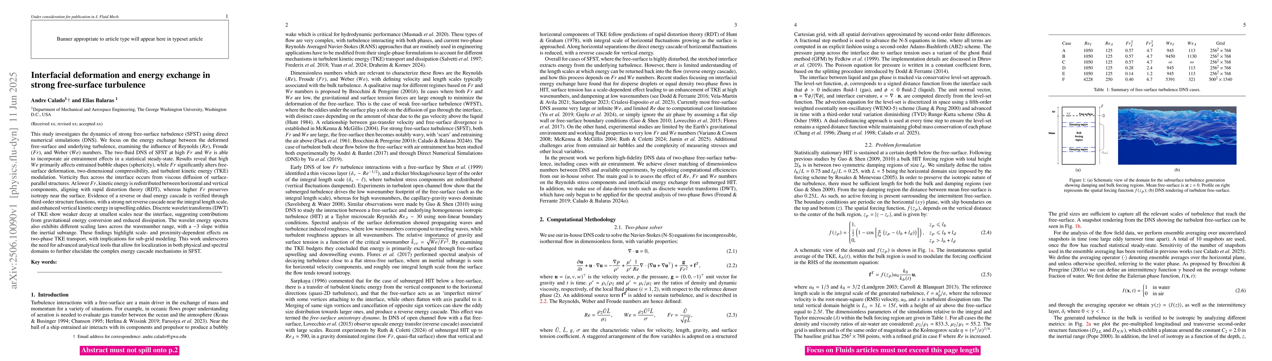 This study investigates strong free-surface turbulence dynamics, revealing how energy is exchanged between a deformed surface and underlying turbulence, with key factors affecting shape, deformation, and kinetic energy.