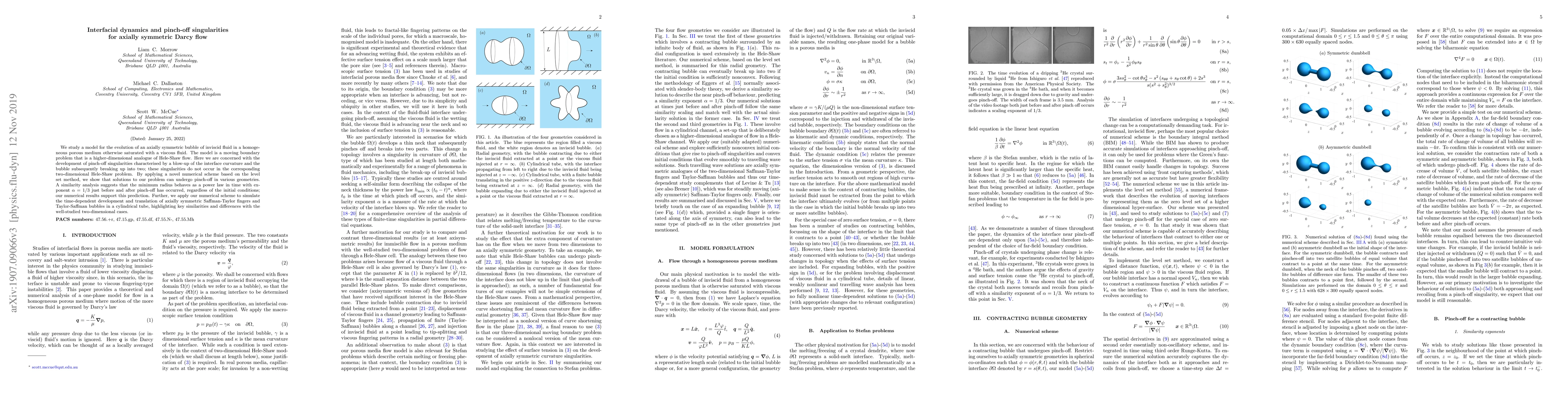 We study a model for the evolution of an axially symmetric bubble of inviscid fluid in a homogeneous porous medium otherwise saturated with a viscous fluid. The model is a moving boundary problem that is a higher-dimensional analogue of Hele-Shaw flow. Here we are concerned with the development of pinch-off singularities characterised by a blow-up of the interface curvature and the bubble subsequently breaking up into two; these singularities do not occur in the corresponding two-dimensional Hele-Shaw problem. By applying a novel numerical scheme based on the level set method, we show that solutions to our problem can undergo pinch-off in various geometries. A similarity analysis suggests that the minimum radius behaves as a power law in time with exponent $\alpha = 1/3$ just before and after pinch-off has occurred, regardless of the initial conditions; our numerical results support this prediction. Further, we apply our numerical scheme to simulate the time-dependent development and translation of axially symmetric Saffman-Taylor fingers and Taylor-Saffman bubbles in a cylindrical tube, highlighting key similarities and differences with the well-studied two-dimensional cases.