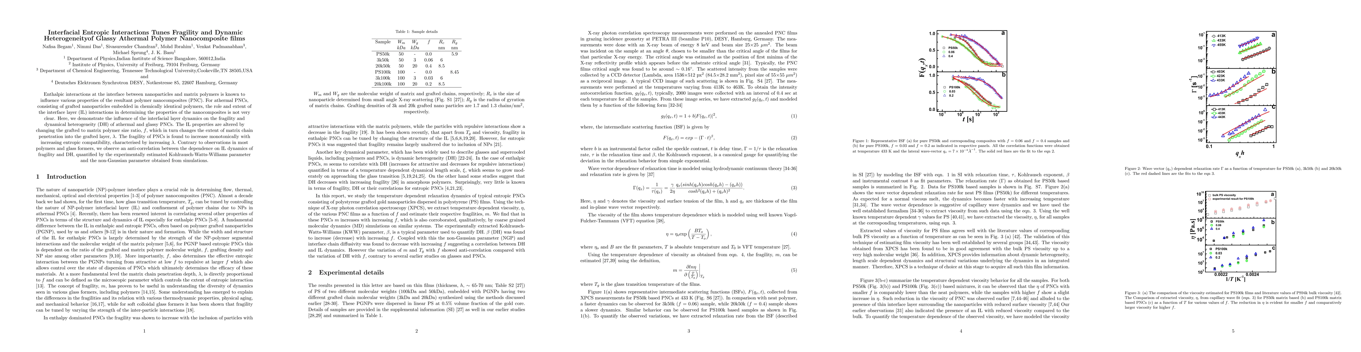 Enthalpic interactions at the interface between nanoparticles and matrix polymers is known to influence various properties of the resultant polymer nanocomposites (PNC). For athermal PNCs, consisting of grafted nanoparticles embedded in chemically identical polymers, the role and extent of the interface layer (IL) interactions in determining the properties of the nanocomposites is not very clear. Here, we demonstrate the influence of the interfacial layer dynamics on the fragility and dynamical heterogeneity (DH) of athermal and glassy PNCs. The IL properties are altered by changing the grafted to matrix polymer size ratio, f, which in turn changes the extent of matrix chain penetration into the grafted layer. The fragility of PNCs is found to increase monotonically with increasing entropic compatibility, characterized by increasing penetration depth. Contrary to observations in most polymers and glass formers, we observe an anti-correlation between the dependence on IL dynamics of fragility and DH, quantified by the experimentally estimated Kohlrausch-Watts-Williams parameter and the non-Gaussian parameter obtained from simulations.