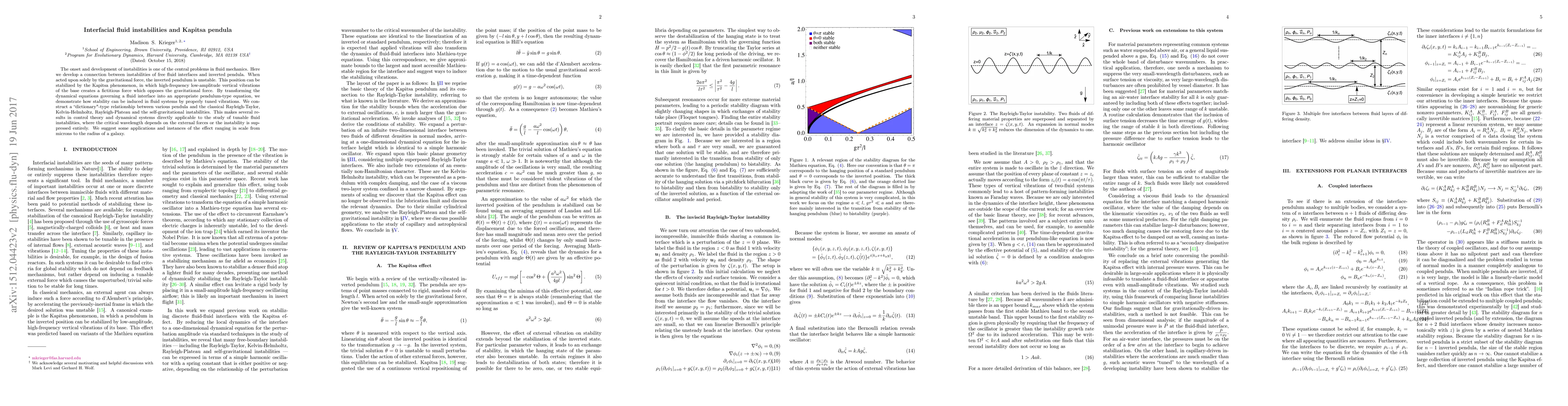This research establishes a link between fluid interface instabilities and inverted pendula, demonstrating how controlled vibrations can stabilize unstable fluid systems, akin to the Kapitsa phenomenon. It provides a 'dictionary'-like mapping between diverse pendula and fluid instabilities, opening new avenues for controlling fluid behaviors in various scales, from microscopic to cosmic.