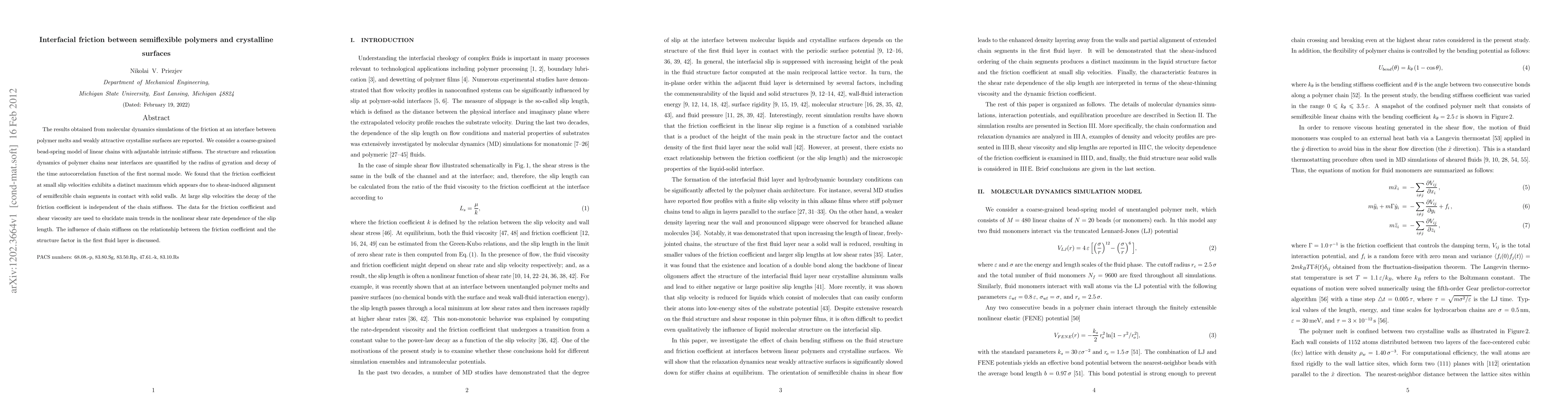 This study uses molecular dynamics simulations to investigate the friction between semiflexible polymer chains and crystalline surfaces, revealing a maximum in friction coefficient at low slip velocities due to chain alignment. At higher velocities, friction becomes independent of chain stiffness, and trends in the slip length's dependence on shear rate are explored.