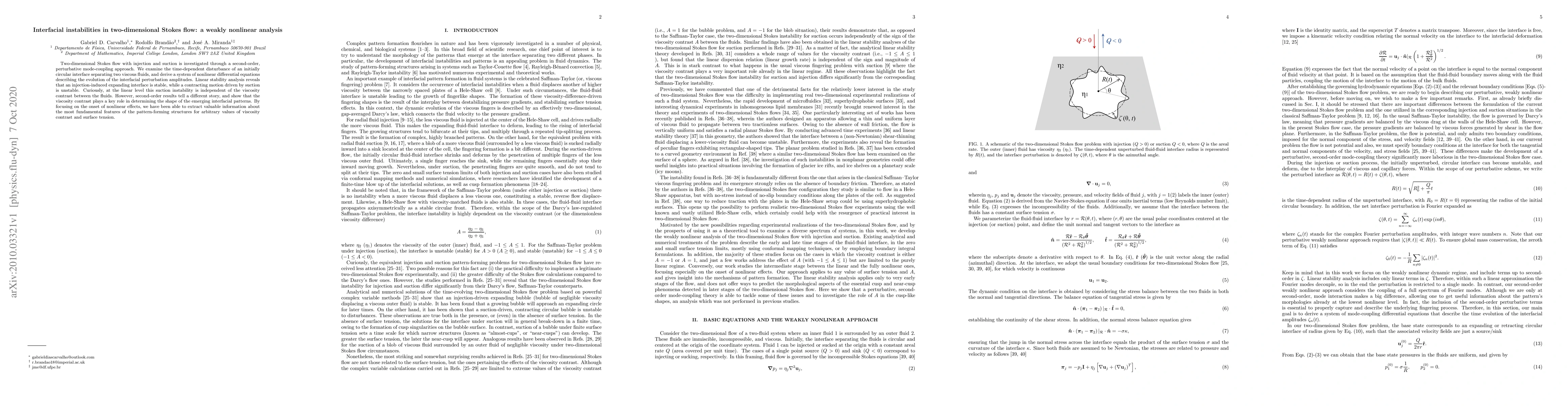 Two-dimensional Stokes flow with injection and suction is investigated through a second-order, perturbative mode-coupling approach. We examine the time-dependent disturbance of an initially circular interface separating two viscous fluids, and derive a system of nonlinear differential equations describing the evolution of the interfacial perturbation amplitudes. Linear stability analysis reveals that an injection-induced expanding interface is stable, while a contracting motion driven by suction is unstable. Curiously, at the linear level this suction instability is independent of the viscosity contrast between the fluids. However, second-order results tell a different story, and show that the viscosity contrast plays a key role in determining the shape of the emerging interfacial patterns. By focusing on the onset of nonlinear effects, we have been able to extract valuable information about the most fundamental features of the pattern-forming structures for arbitrary values of viscosity contrast and surface tension.
