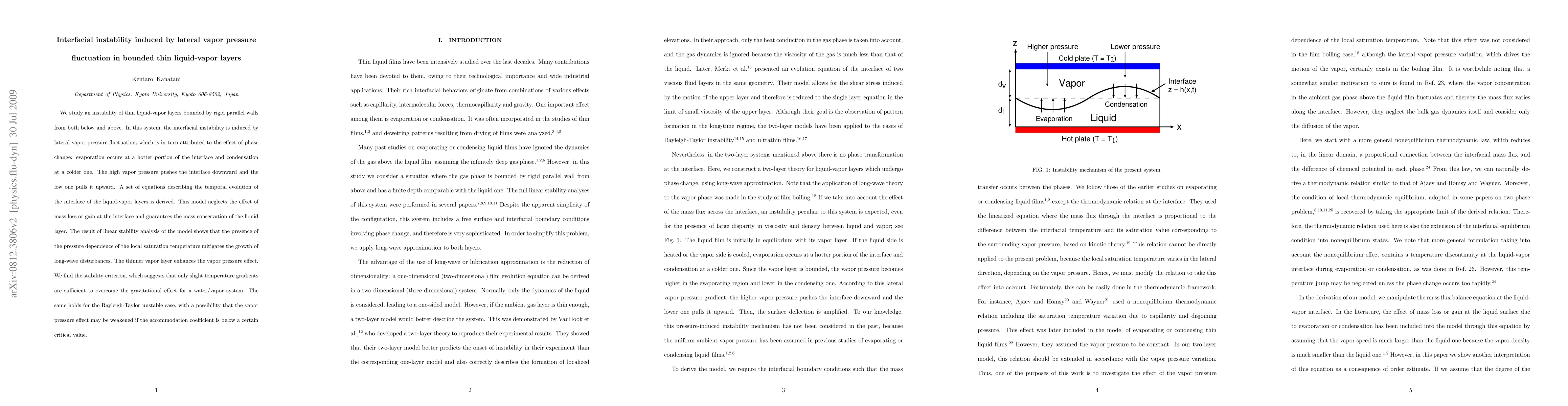 This paper investigates the interfacial instability in thin liquid-vapor layers due to lateral vapor pressure fluctuations caused by phase change effects. The study derives equations for the interface's temporal evolution, revealing that slight temperature gradients can overcome gravitational effects, especially in thinner vapor layers.