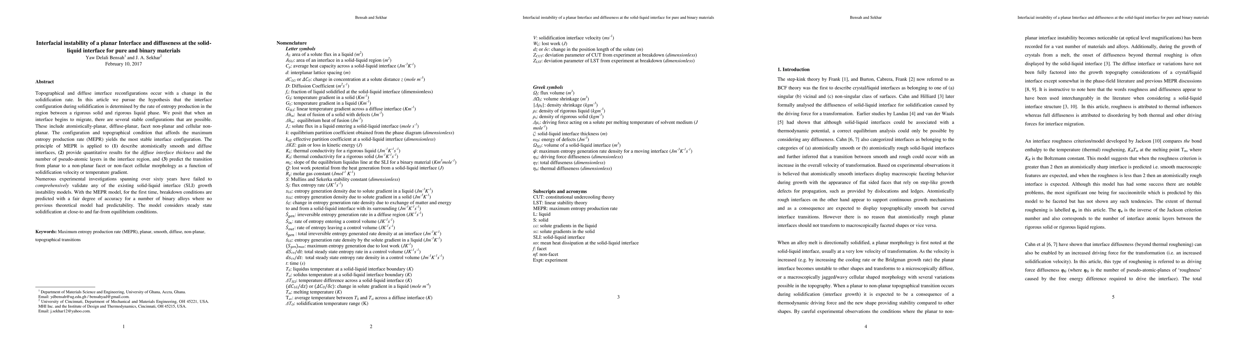 Topographical and diffuse interface reconfigurations occur with a change in the solidification rate. In this article we pursue the hypothesis that the interface configuration during solidification is determined by the rate of entropy production in the region between a rigorous solid and rigorous liquid phase. We posit that when an interface begins to migrate, there are several stable configurations that are possible. These include atomistically-planar, diffuse-planar, facet non-planar and cellular non-planar. The configuration and topographical condition that affords the maximum entropy production rate (MEPR) yields the most stable interface configuration. The principle of MEPR is applied to (1) describe atomistically smooth and diffuse interfaces, (2) provide quantitative results for the diffuse interface thickness and the number of pseudo-atomic layers in the interface region, and (3) predict the transition from planar to a non-planar facet or non-facet cellular morphology as a function of solidification velocity or temperature gradient. Numerous experimental investigations spanning over sixty years have failed to comprehensively validate any of the existing solid-liquid interface (SLI) growth instability models. With the MEPR model, for the first time, breakdown conditions are predicted with a fair degree of accuracy for a number of binary alloys where no previous theoretical model had predictability. The model considers steady state solidification at close-to and far-from equilibrium conditions.