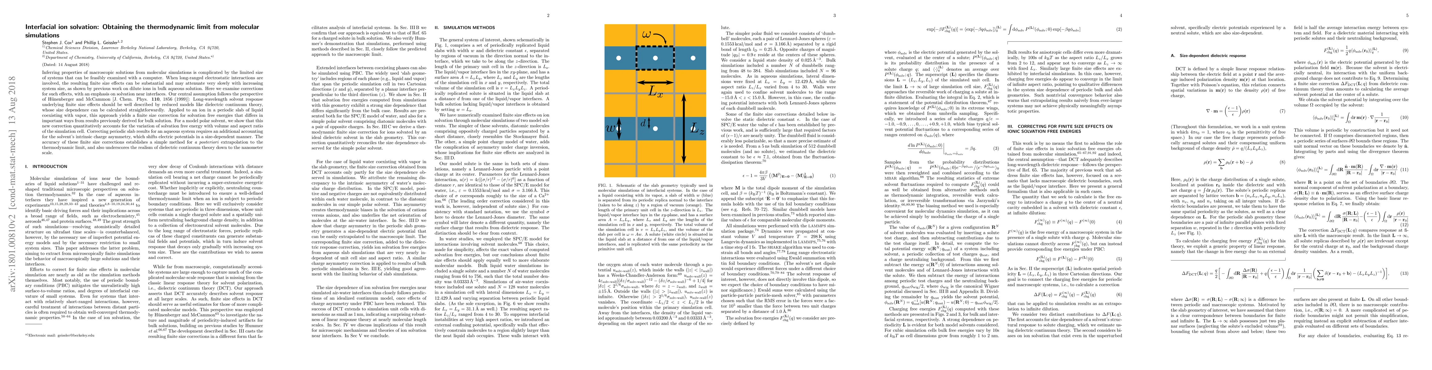 This paper proposes a method to correct finite size effects in molecular simulations of interfacial ion solvation, showing that dielectric continuum theory can accurately describe long-wavelength solvent responses. The proposed corrections enable extrapolation to the thermodynamic limit, providing a reliable approach for studying solvation near interfaces in confined systems.