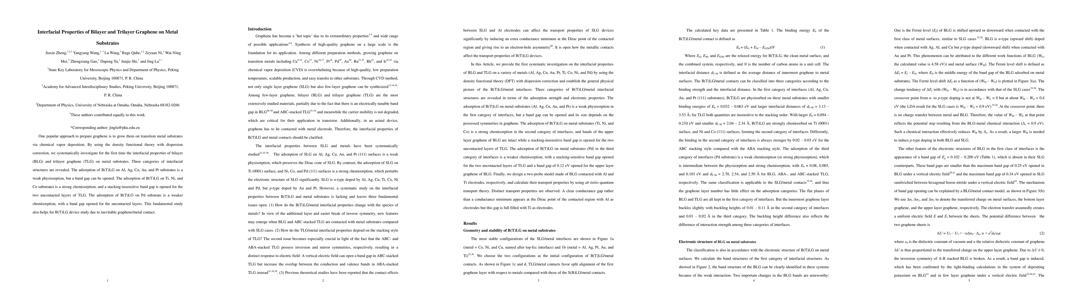 This study uses density functional theory to analyze the interfacial properties of bilayer and trilayer graphene on various metal substrates, revealing three categories of adsorption: weak physisorption on Al, Ag, Cu, Au, and Pt, strong chemisorption on Ti, Ni, and Co, and weaker chemisorption on Pd, with implications for band gap formation and graphene device applications.