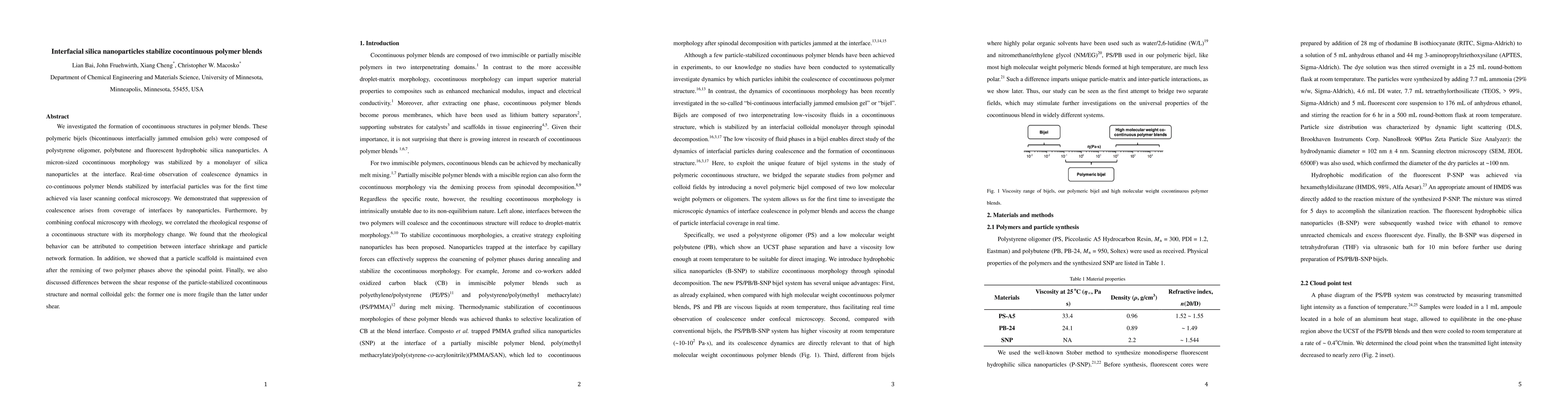 This study explores how silica nanoparticles stabilize cocontinuous polymer blends, achieving a micron-sized morphology via nanoparticle-covered interfaces. The research combines confocal microscopy and rheology to reveal the dynamics and rheological behavior of these blends, highlighting the fragility of particle-stabilized structures under shear.