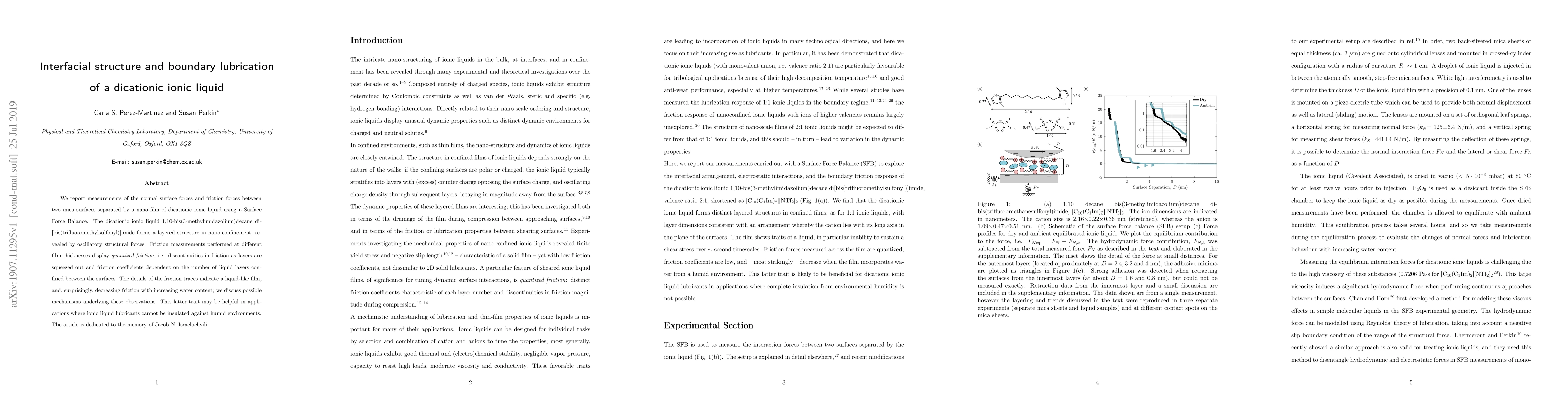 We report measurements of the normal surface forces and friction forces between two mica surfaces separated by a nano-film of dicationic ionic liquid using a Surface Force Balance. The dicationic ionic liquid 1,10-bis(3-methylimidazolium)decane di- [bis(trifluoromethylsulfonyl)]imide forms a layered structure in nano-confinement, revealed by oscillatory structural forces. Friction measurements performed at different film thicknesses display quantized friction, i.e. discontinuities in friction as layers are squeezed out and friction coefficients dependent on the number of liquid layers confined between the surfaces. The details of the friction traces indicate a liquid-like film, and, surprisingly, decreasing friction with increasing water content; we discuss possible mechanisms underlying these observations. This latter trait may be helpful in applications where ionic liquid lubricants cannot be insulated against humid environments. The article is dedicated to the memory of Jacob N. Israelachvili.