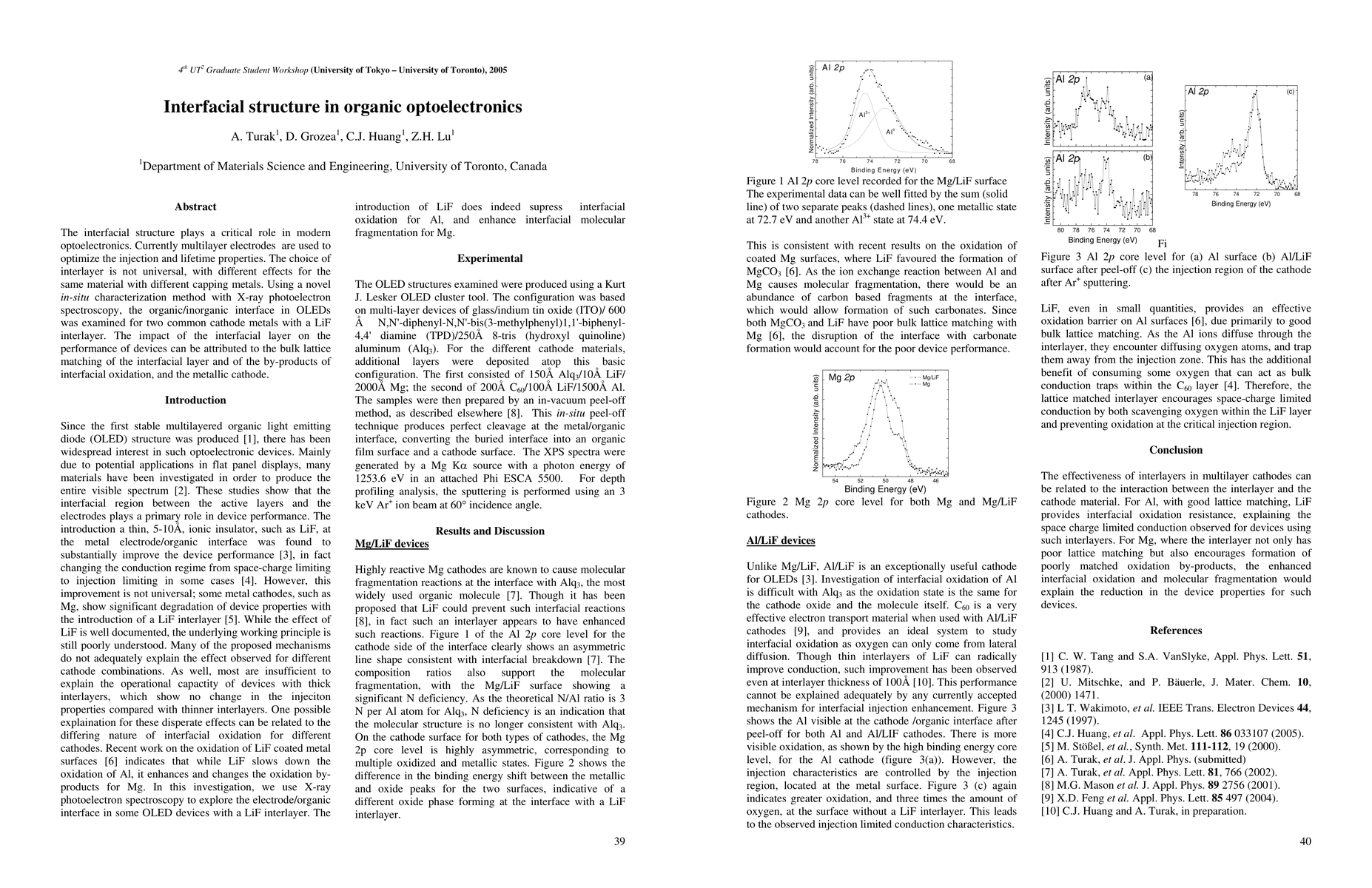 Researchers studied the interfacial structure in organic optoelectronics using X-ray photoelectron spectroscopy to optimize OLED performance with different cathode metals and LiF interlayers.