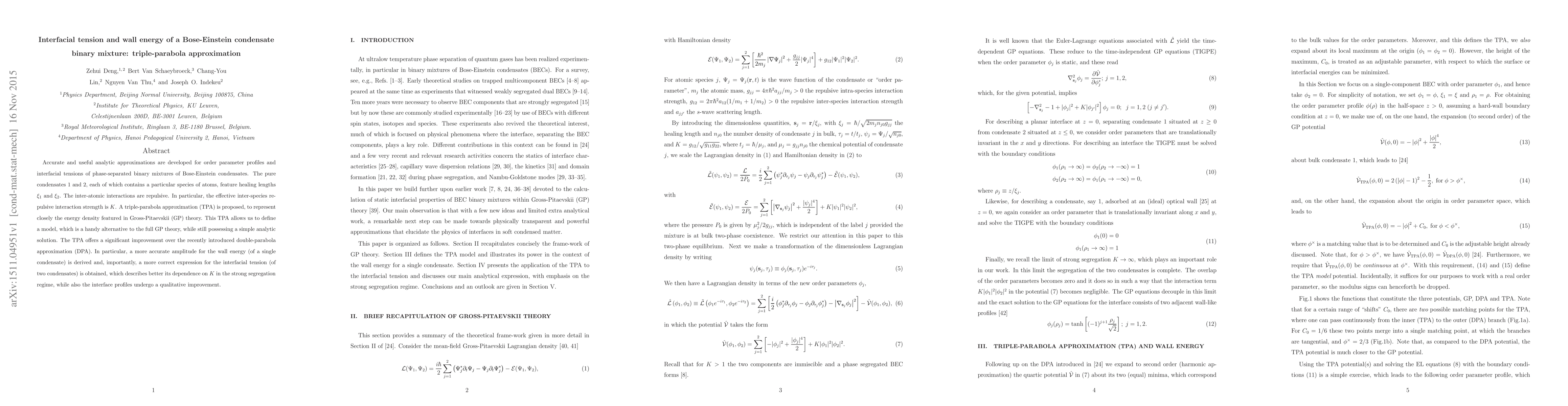 Accurate and useful analytic approximations are developed for order parameter profiles and interfacial tensions of phase-separated binary mixtures of Bose-Einstein condensates. The pure condensates 1 and 2, each of which contains a particular species of atoms, feature healing lengths $\xi_1$ and $\xi_2$. The inter-atomic interactions are repulsive. In particular, the effective inter-species repulsive interaction strength is $K$. A triple-parabola approximation (TPA) is proposed, to represent closely the energy density featured in Gross-Pitaevskii (GP) theory. This TPA allows us to define a model, which is a handy alternative to the full GP theory, while still possessing a simple analytic solution. The TPA offers a significant improvement over the recently introduced double-parabola approximation (DPA). In particular, a more accurate amplitude for the wall energy (of a single condensate) is derived and, importantly, a more correct expression for the interfacial tension (of two condensates) is obtained, which describes better its dependence on $K$ in the strong segregation regime, while also the interface profiles undergo a qualitative improvement.