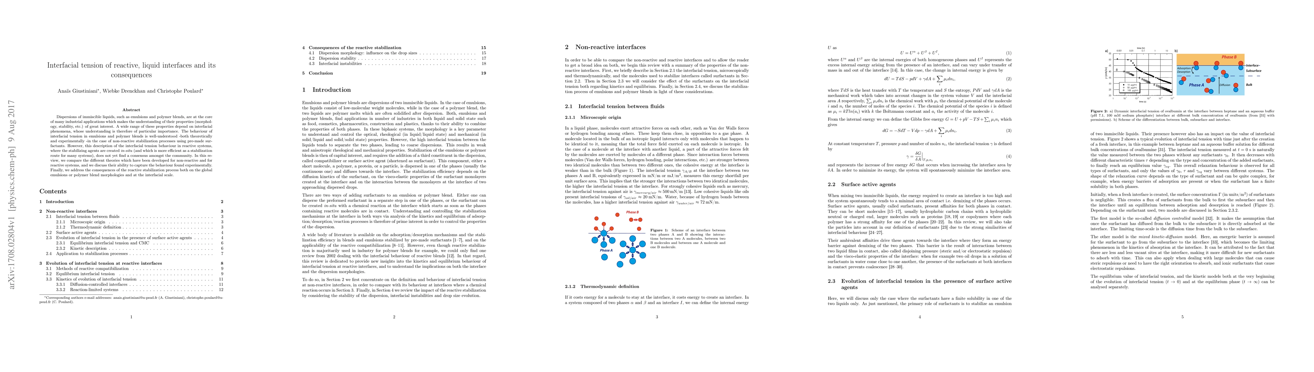 This paper reviews the interfacial tension behavior in reactive liquid interfaces, comparing non-reactive and reactive stabilization theories, and discusses the impact of in-situ stabilization on emulsion and polymer blend morphologies. It highlights the lack of consensus on reactive stabilization processes and their experimental implications.