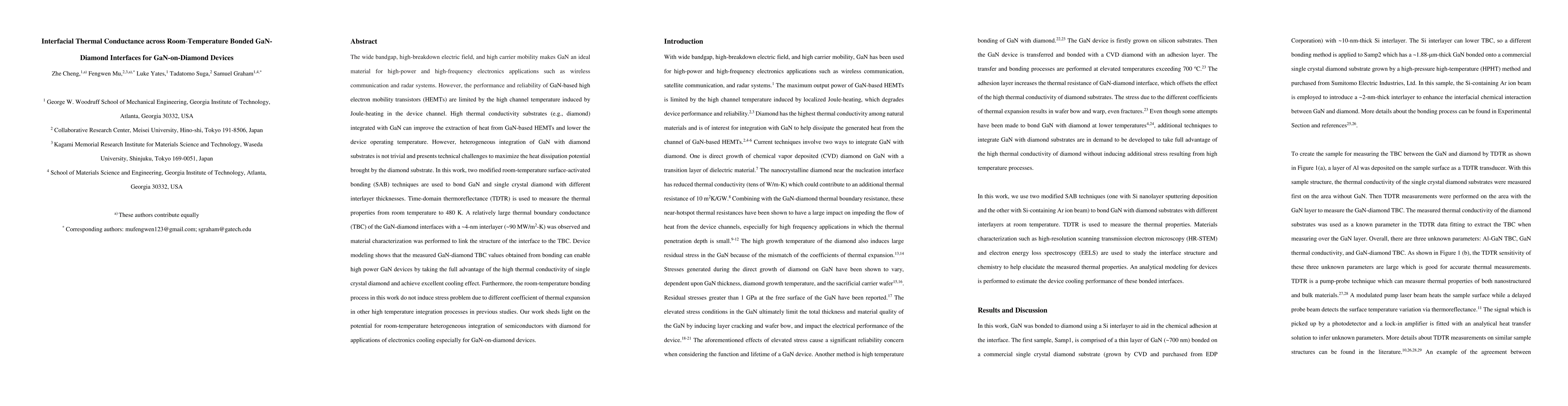 This paper investigates room-temperature bonding techniques for integrating GaN with diamond substrates to enhance thermal conductivity and improve the performance of GaN-based high-power electronic devices. The study finds that a 4nm interlayer thickness yields a relatively large interfacial thermal conductance, enabling effective heat dissipation and alleviating Joule-heating issues, without inducing stress.