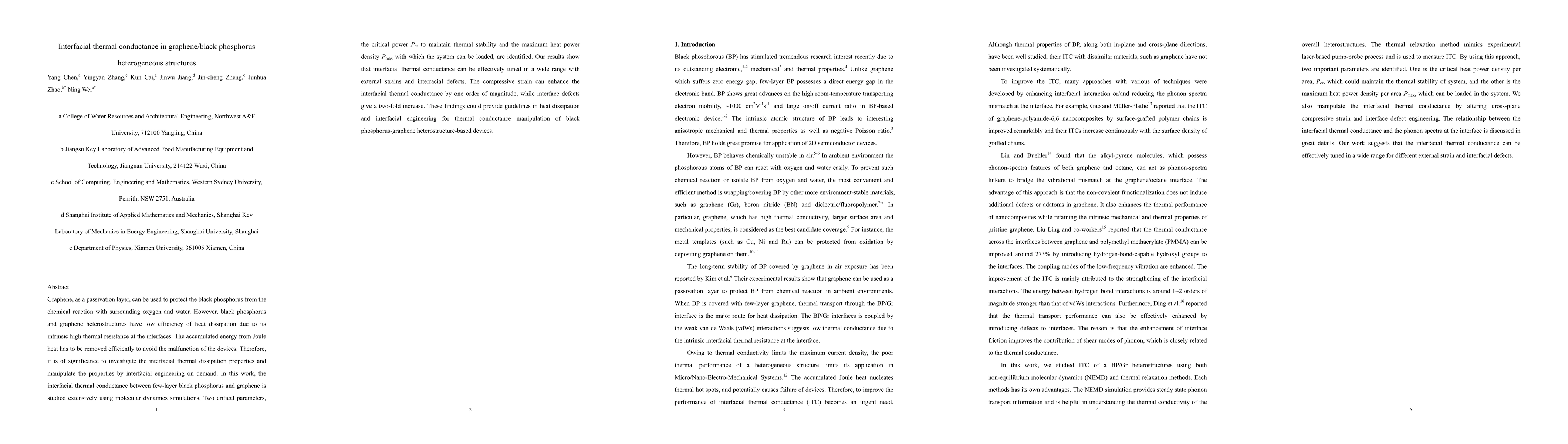 This study investigates the interfacial thermal conductance in graphene/black phosphorus heterostructures using molecular dynamics simulations. The research identifies critical parameters for thermal stability and finds that external strains and interface defects can significantly enhance thermal conductance, offering insights for device heat dissipation.