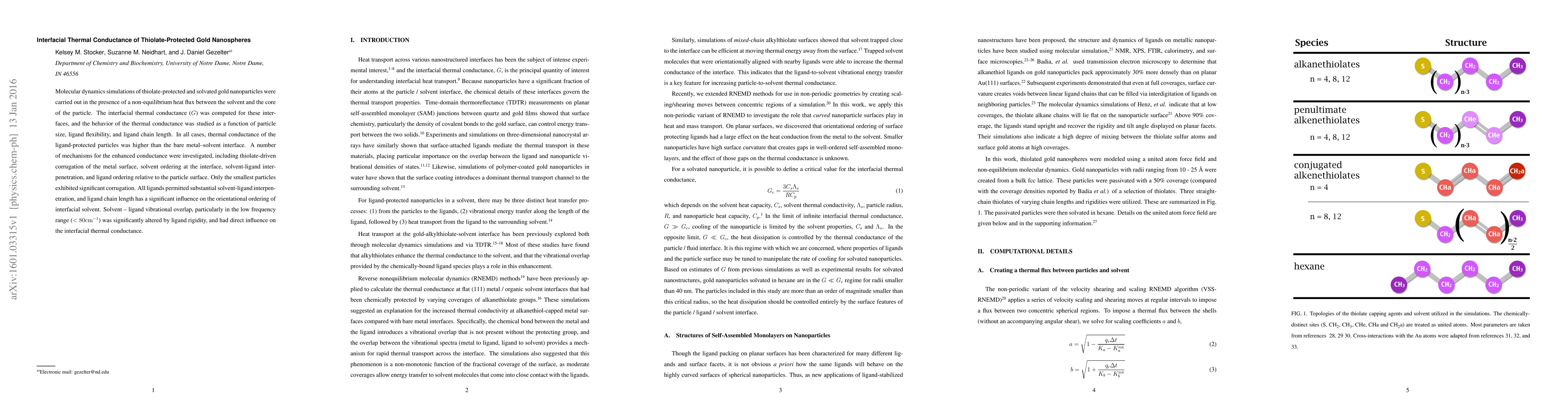 Molecular dynamics simulations of thiolate-protected and solvated gold nanoparticles were carried out in the presence of a non-equilibrium heat flux between the solvent and the core of the particle. The interfacial thermal conductance ($G$) was computed for these interfaces, and the behavior of the thermal conductance was studied as a function of particle size, ligand flexibility, and ligand chain length. In all cases, thermal conductance of the ligand-protected particles was higher than the bare metal-solvent interface. A number of mechanisms for the enhanced conductance were investigated, including thiolate-driven corrugation of the metal surface, solvent ordering at the interface, solvent-ligand interpenetration, and ligand ordering relative to the particle surface. Only the smallest particles exhibited significant corrugation. All ligands permitted substantial solvent-ligand interpenetration, and ligand chain length has a significant influence on the orientational ordering of interfacial solvent. Solvent-ligand vibrational overlap, particularly in the low frequency range ($< 80 \mathrm{cm}^{-1}$) was significantly altered by ligand rigidity, and had direct influence on the interfacial thermal conductance.