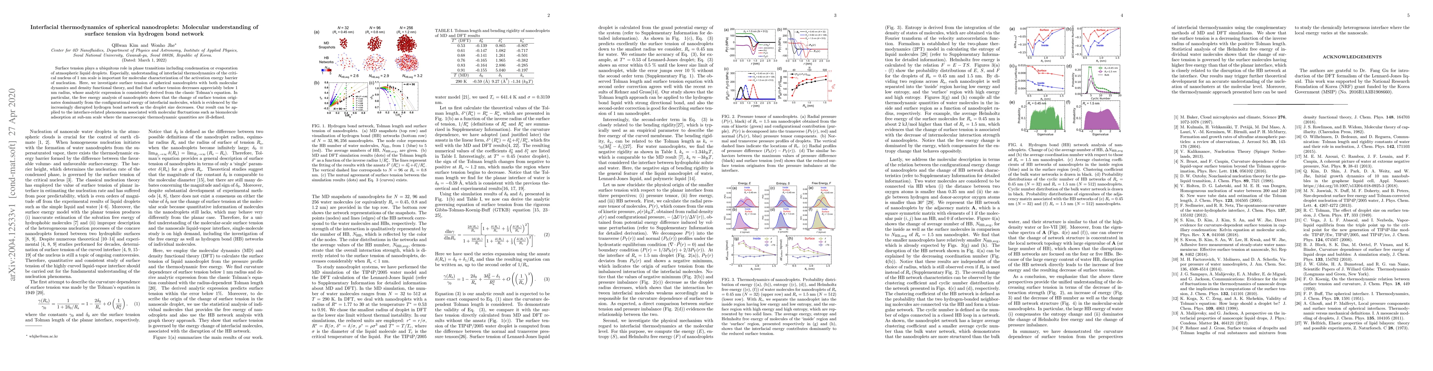 Surface tension plays a ubiquitous role in phase transitions including condensation or evaporation of atmospheric liquid droplets. Especially, understanding of interfacial thermodynamics of the critical nucleus of 1 nm scale is important for molecular characterization of the activation energy barrier of nucleation. Here, we investigate surface tension of spherical nanodroplets with both molecular dynamics and density functional theory, and find that surface tension decreases appreciably below 1 nm radius, whose analytic expression is consistently derived from the classic Tolman's equation. In particular, the free energy analysis of nanodroplets shows that the change of surface tension originates dominantly from the configurational energy of interfacial molecules, which is evidenced by the increasingly disrupted hydrogen bond network as the droplet size decreases. Our result can be applied to the interface-related phenomena associated with molecular fluctuations such as biomolecule adsorption at sub-nm scale where the macroscopic thermodynamic quantities are ill-defined.
