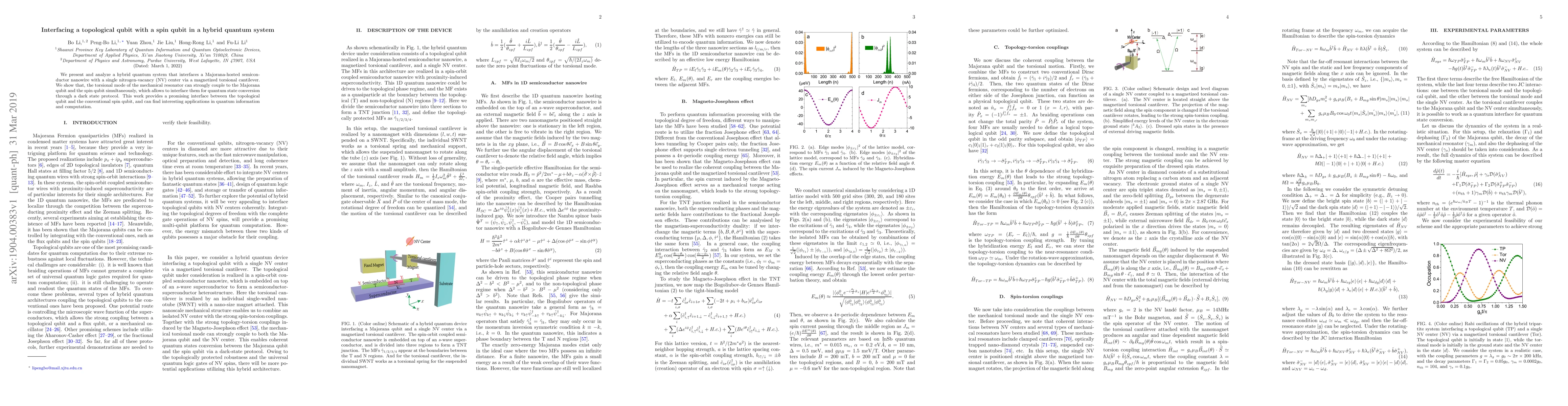 This paper proposes a hybrid quantum system that interfaces a topological qubit in a semiconductor nanowire with a spin qubit in a nitrogen-vacancy center using a magnetized torsional cantilever. The study demonstrates strong coupling between the torsional mode and both qubits, enabling quantum state conversion via a dark state protocol, thus promising a new interface for quantum information and computation.