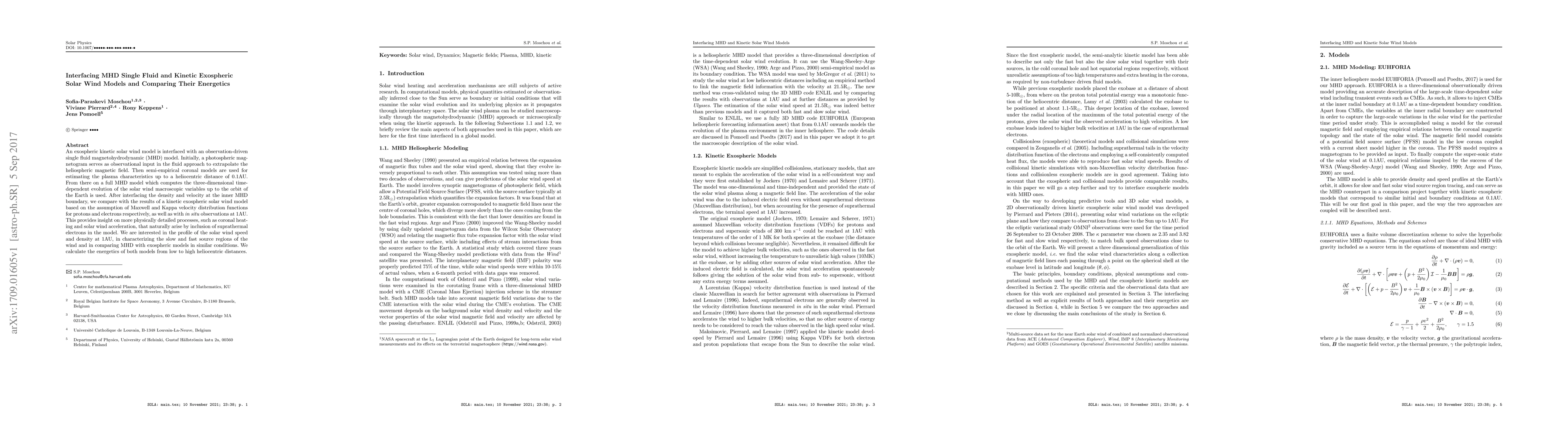 An exospheric kinetic solar wind model is interfaced with an observation-driven single fluid magnetohydrodynamic (MHD) model. Initially, a photospheric magnetogram serves as observational input in the fluid approach to extrapolate the heliospheric magnetic field. Then semi-empirical coronal models are used for estimating the plasma characteristics up to a heliocentric distance of 0.1AU. From there on a full MHD model which computes the three-dimensional time-dependent evolution of the solar wind macroscopic variables up to the orbit of the Earth is used. After interfacing the density and velocity at the inner MHD boundary, we compare with the results of a kinetic exospheric solar wind model based on the assumption of Maxwell and Kappa velocity distribution functions for protons and electrons respectively, as well as with \textit{in situ} observations at 1AU. This provides insight on more physically detailed processes, such as coronal heating and solar wind acceleration, that naturally arise by inclusion of suprathermal electrons in the model. We are interested in the profile of the solar wind speed and density at 1AU, in characterizing the slow and fast source regions of the wind and in comparing MHD with exospheric models in similar conditions. We calculate the energetics of both models from low to high heliocentric distances.