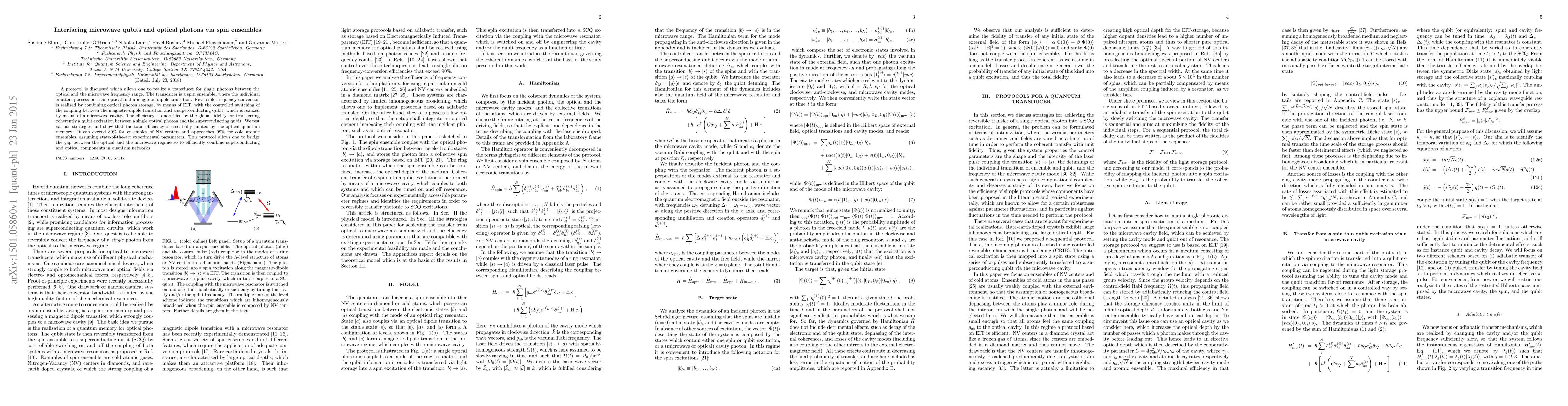 This paper proposes a protocol for interfacing microwave qubits with optical photons using spin ensembles, achieving reversible frequency conversion through optical photon storage and controlled coupling with a superconducting qubit. The efficiency of the protocol, limited primarily by the optical quantum memory, can exceed 80% for NV centers and approach 99% for cold atomic ensembles, enabling efficient integration of optical and microwave components in quantum networks.