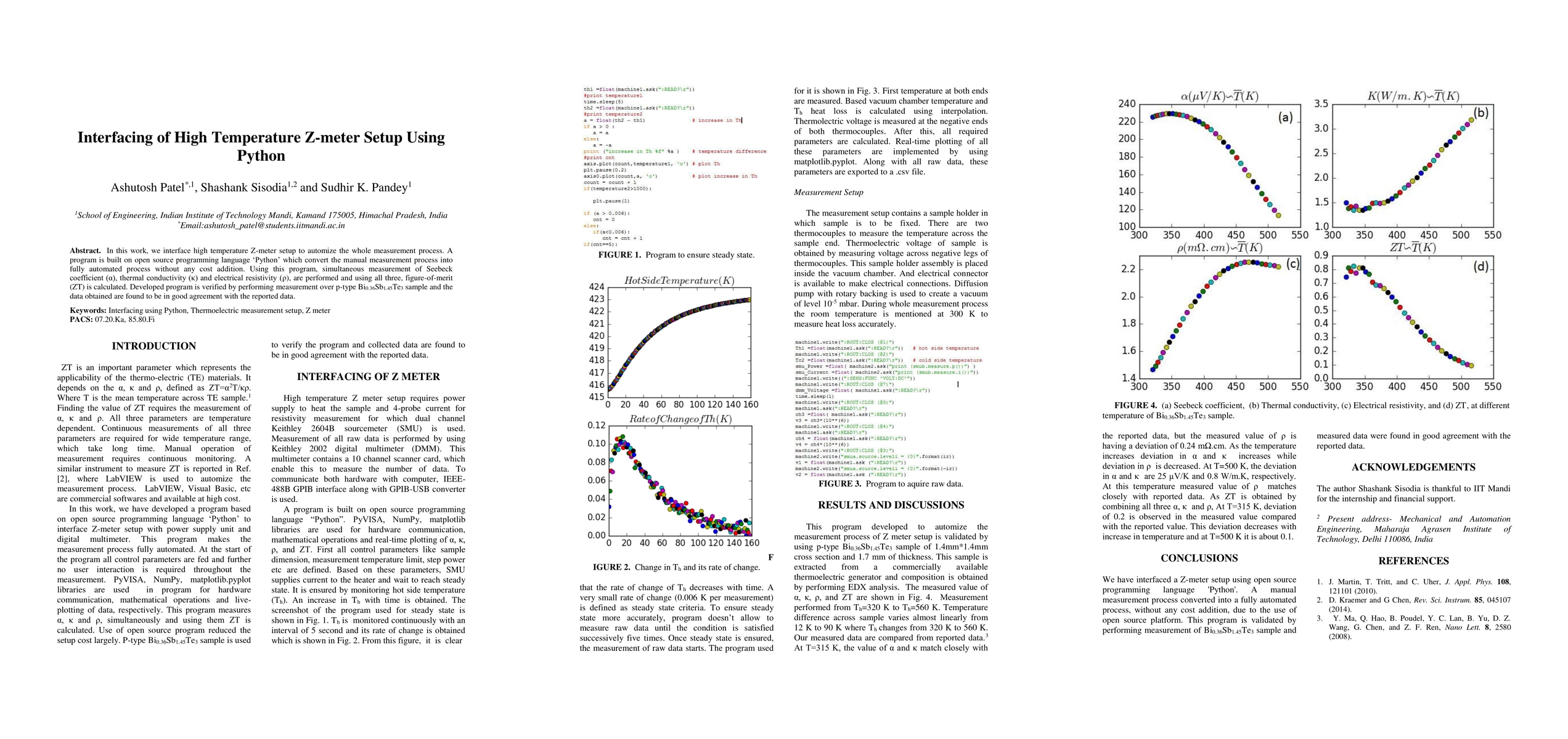 This paper details the development of a Python-based program to automate the high-temperature Z-meter measurement process, enabling simultaneous measurement of Seebeck coefficient, thermal conductivity, and electrical resistivity, and calculating the figure-of-merit (ZT). The program's accuracy is validated through measurements on a p-type Bi0.36Sb1.45Te3 sample, showing good agreement with reported data.