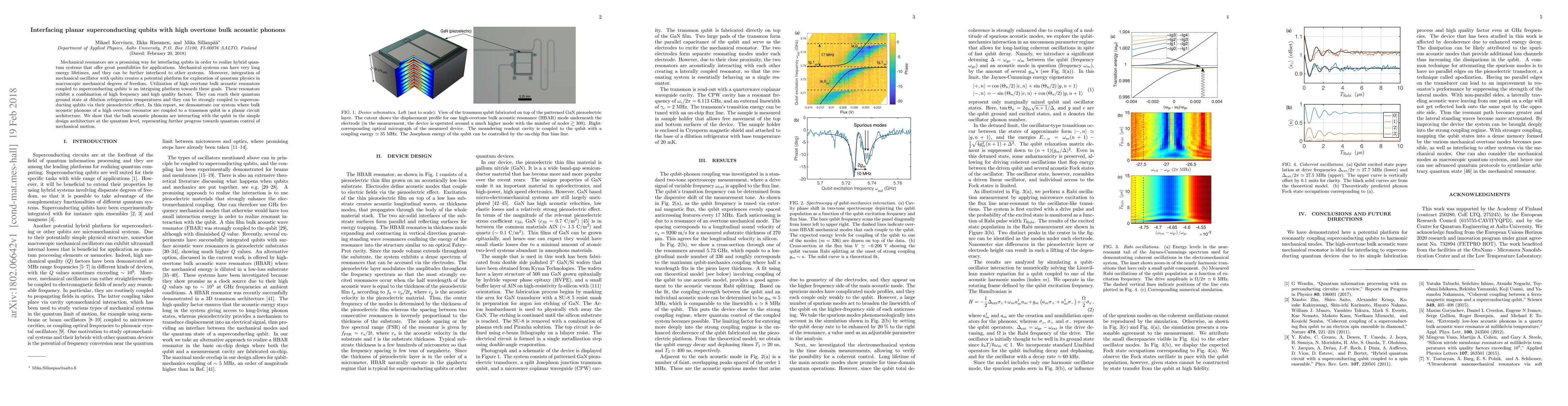Mechanical resonators are a promising way for interfacing qubits in order to realize hybrid quantum systems that offer great possibilities for applications. Mechanical systems can have very long energy lifetimes, and they can be further interfaced to other systems. Moreover, integration of mechanical oscillator with qubits creates a potential platform for exploration of quantum physics in macroscopic mechanical degrees of freedom. Utilization of high overtone bulk acoustic resonators coupled to superconducting qubits is an intriguing platform towards these goals. These resonators exhibit a combination of high frequency and high quality factors. They can reach their quantum ground state at dilution refrigeration temperatures and they can be strongly coupled to superconducting qubits via their piezoelectric effect. In this report, we demonstrate our system where bulk acoustic phonons of a high overtone resonator are coupled to a transmon qubit in a planar circuit architecture. We show that the bulk acoustic phonons are interacting with the qubit in the simple design architecture at the quantum level, representing further progress towards quantum control of mechanical motion.