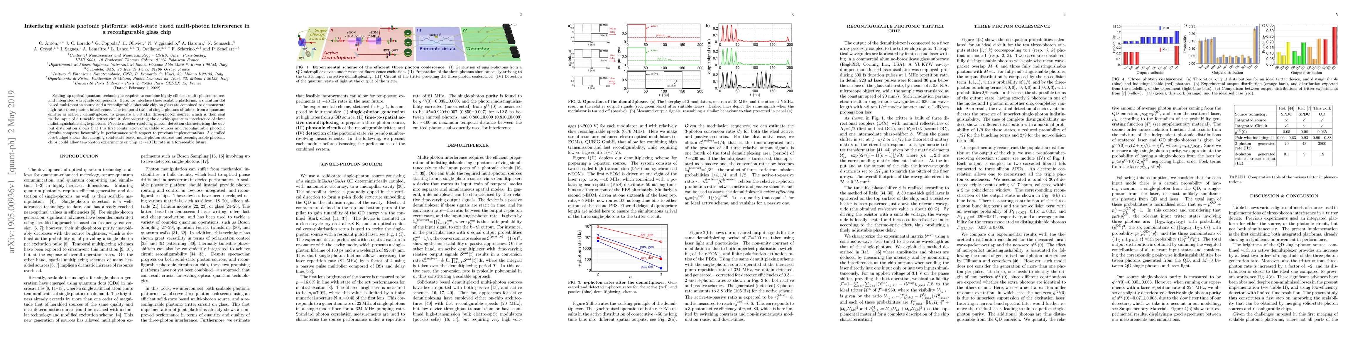 This research combines scalable quantum dot multi-photon sources with reconfigurable photonic chips on glass to achieve high-rate three-photon interference, demonstrating potential for ten-photon experiments at 40 Hz in the future. The integration shows competitive performance in quantum interference compared to previous implementations.