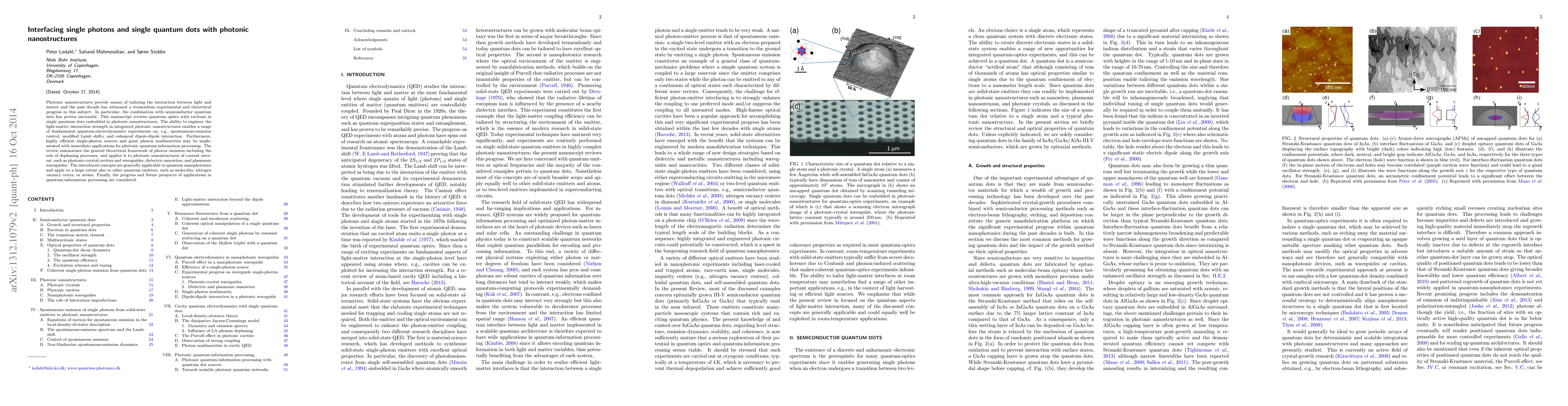 This paper reviews the interaction between single quantum dots and photonic nanostructures, focusing on the engineering of light-matter interactions for quantum-electrodynamics experiments and applications in photonic quantum-information processing. It discusses theoretical frameworks for photon emission and applies these to various photonic nanostructures, highlighting potential for single-photon sources and nonlinear optics.