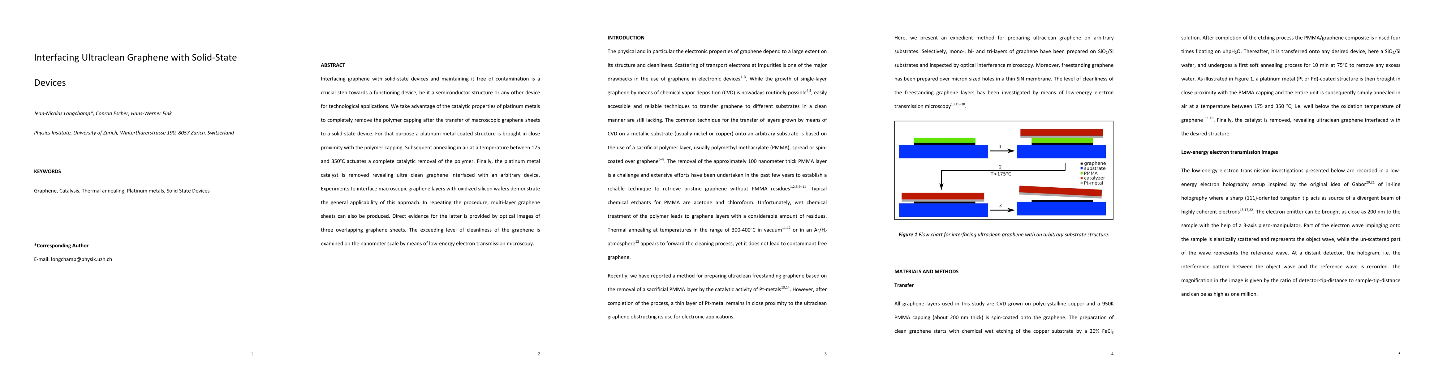 This paper details a method to interface ultraclean graphene with solid-state devices by using platinum metal catalysis to remove polymer contaminants, followed by annealing, and demonstrates its application on silicon wafers. The cleanliness of the graphene is confirmed via low-energy electron transmission microscopy.
