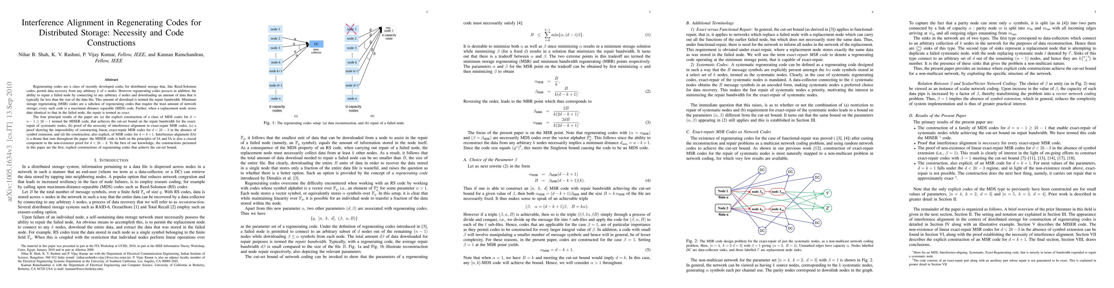 Regenerating codes are a class of recently developed codes for distributed storage that, like Reed-Solomon codes, permit data recovery from any arbitrary k of n nodes. However regenerating codes possess in addition, the ability to repair a failed node by connecting to any arbitrary d nodes and downloading an amount of data that is typically far less than the size of the data file. This amount of download is termed the repair bandwidth. Minimum storage regenerating (MSR) codes are a subclass of regenerating codes that require the least amount of network storage; every such code is a maximum distance separable (MDS) code. Further, when a replacement node stores data identical to that in the failed node, the repair is termed as exact. The four principal results of the paper are (a) the explicit construction of a class of MDS codes for d = n-1 >= 2k-1 termed the MISER code, that achieves the cut-set bound on the repair bandwidth for the exact-repair of systematic nodes, (b) proof of the necessity of interference alignment in exact-repair MSR codes, (c) a proof showing the impossibility of constructing linear, exact-repair MSR codes for d < 2k-3 in the absence of symbol extension, and (d) the construction, also explicit, of MSR codes for d = k+1. Interference alignment (IA) is a theme that runs throughout the paper: the MISER code is built on the principles of IA and IA is also a crucial component to the non-existence proof for d < 2k-3. To the best of our knowledge, the constructions presented in this paper are the first, explicit constructions of regenerating codes that achieve the cut-set bound.