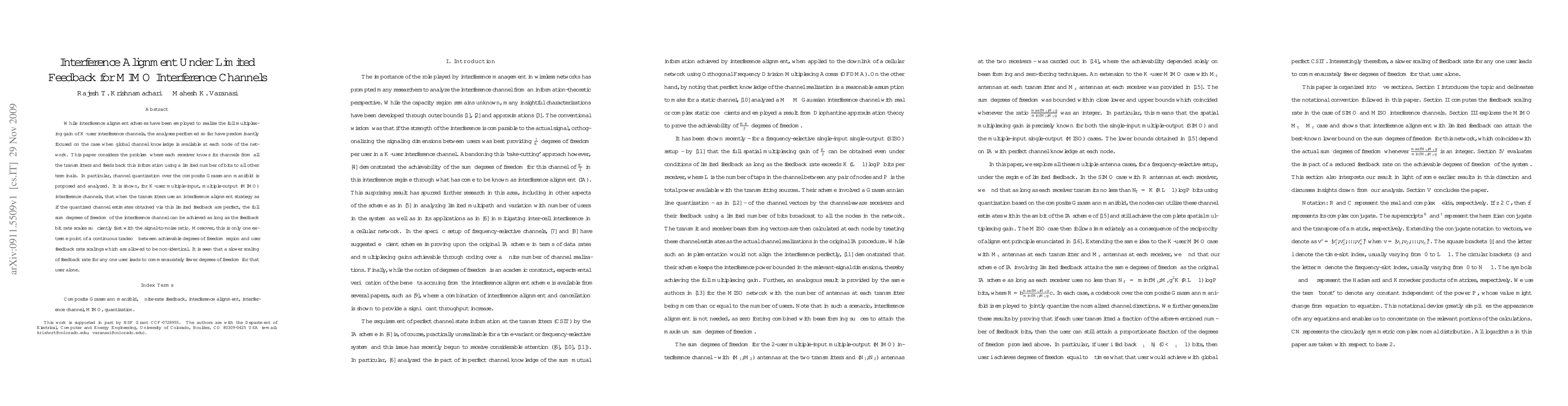 This paper explores interference alignment in MIMO channels under limited feedback, proposing channel quantization over the composite Grassmann manifold. It demonstrates that full sum degrees of freedom can be achieved if feedback bit rates scale sufficiently fast with signal-to-noise ratio, revealing a continuous tradeoff between achievable degrees of freedom and feedback rate scaling.