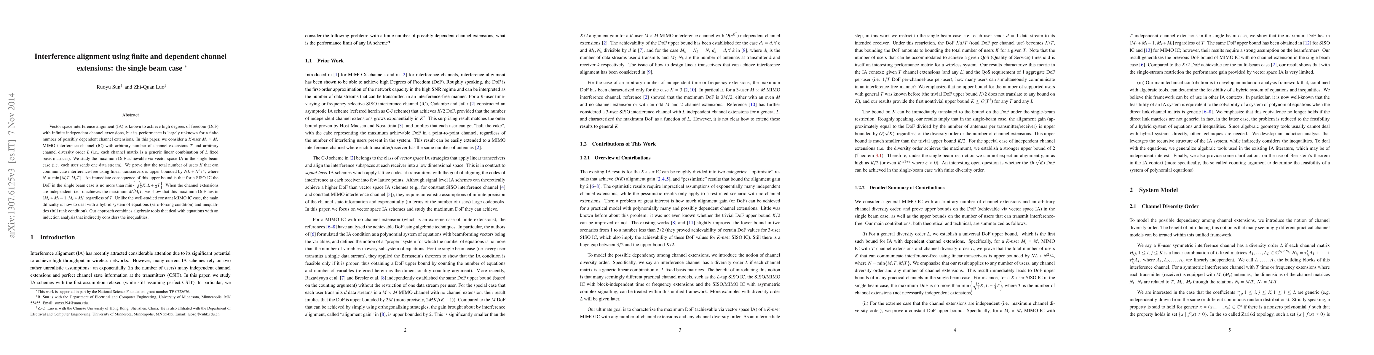 Vector space interference alignment (IA) is known to achieve high degrees of freedom (DoF) with infinite independent channel extensions, but its performance is largely unknown for a finite number of possibly dependent channel extensions. In this paper, we consider a $K$-user $M_t \times M_r$ MIMO interference channel (IC) with arbitrary number of channel extensions $T$ and arbitrary channel diversity order $L$ (i.e., each channel matrix is a generic linear combination of $L$ fixed basis matrices). We study the maximum DoF achievable via vector space IA in the single beam case (i.e. each user sends one data stream). We prove that the total number of users $K$ that can communicate interference-free using linear transceivers is upper bounded by $NL+N^2/4$, where $N = \min\{M_tT, M_rT \}$. An immediate consequence of this upper bound is that for a SISO IC the DoF in the single beam case is no more than $\min\left\{\sqrt{ 5K/4}, L + T/4\right\}$. When the channel extensions are independent, i.e. $ L$ achieves the maximum $M_r M_t T $, we show that this maximum DoF lies in $[M_r+M_t-1, M_r+M_t]$ regardless of $T$. Unlike the well-studied constant MIMO IC case, the main difficulty is how to deal with a hybrid system of equations (zero-forcing condition) and inequalities (full rank condition). Our approach combines algebraic tools that deal with equations with an induction analysis that indirectly considers the inequalities.