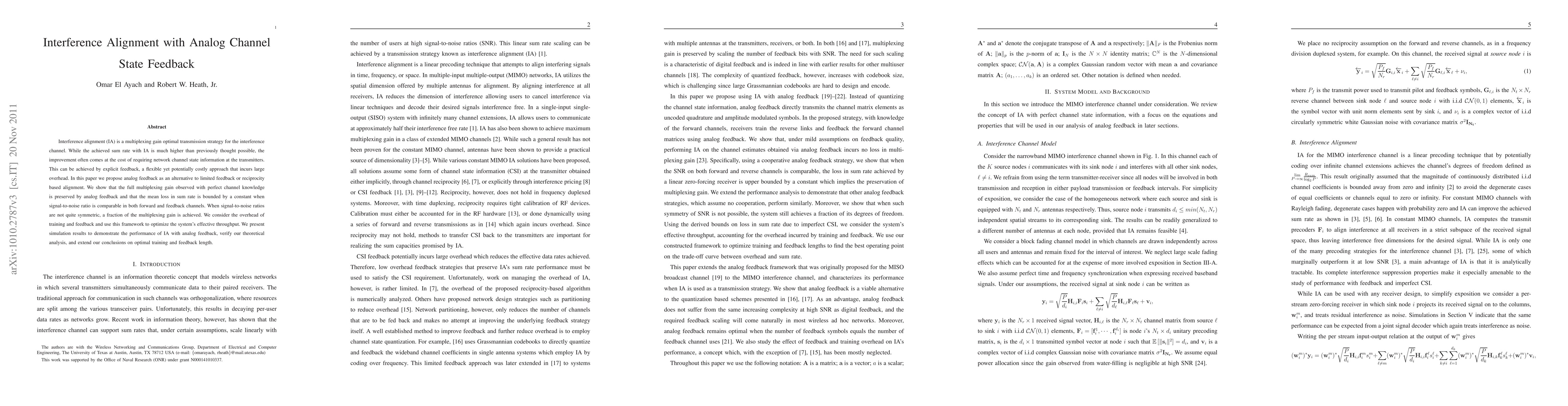 This paper proposes using analog channel state feedback as an alternative to explicit feedback in interference alignment, demonstrating that it preserves multiplexing gain with bounded sum rate loss under symmetric signal-to-noise ratios and achieves a fraction of the gain when ratios are asymmetric. Simulation results validate the theoretical analysis and optimize training and feedback overhead.