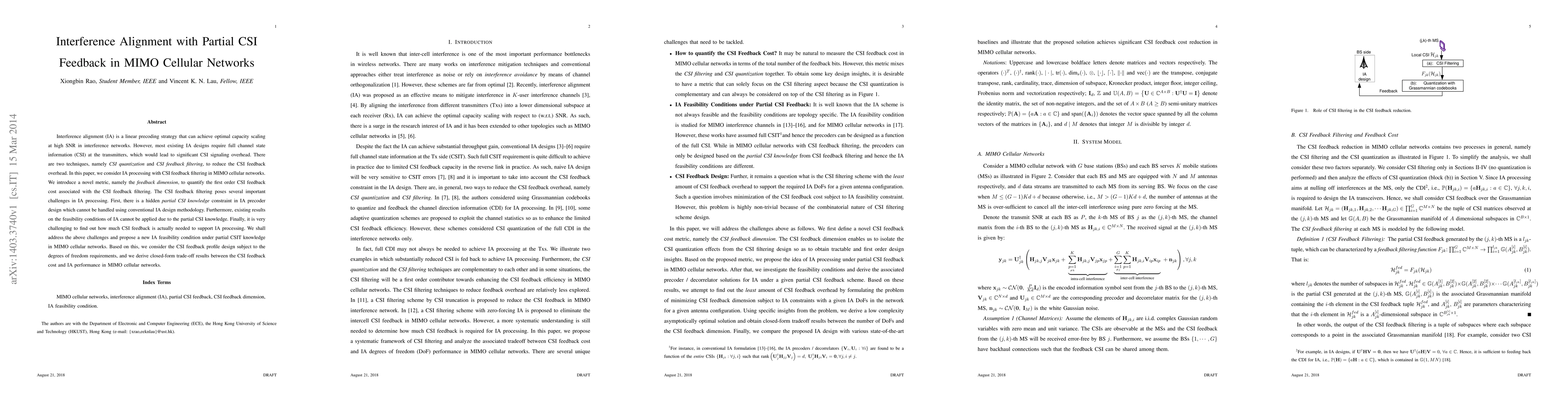 This paper proposes a novel interference alignment (IA) strategy for MIMO cellular networks that employs CSI feedback filtering to reduce signaling overhead. It introduces a new metric, the feedback dimension, to quantify the CSI feedback cost and addresses challenges in IA processing under partial CSI knowledge, proposing a new feasibility condition and deriving trade-off results between CSI feedback cost and IA performance.