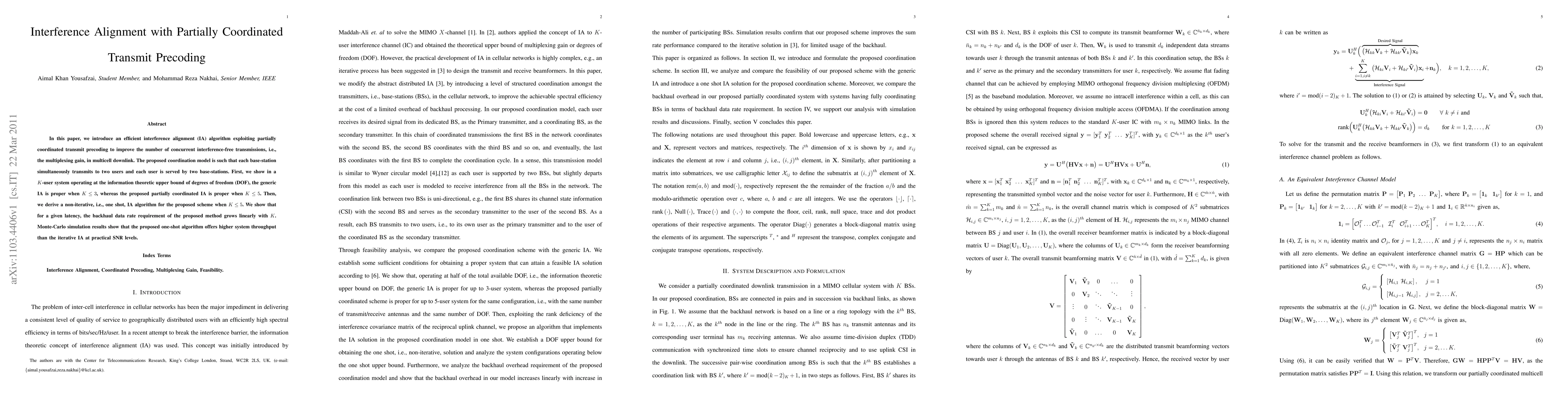 This paper proposes an efficient interference alignment algorithm using partially coordinated transmit precoding to enhance multiplexing gain in multicell downlink systems. The algorithm achieves proper interference alignment for up to 5 users, compared to the generic IA's limit of 3 users, and demonstrates higher system throughput through a non-iterative, one-shot approach.
