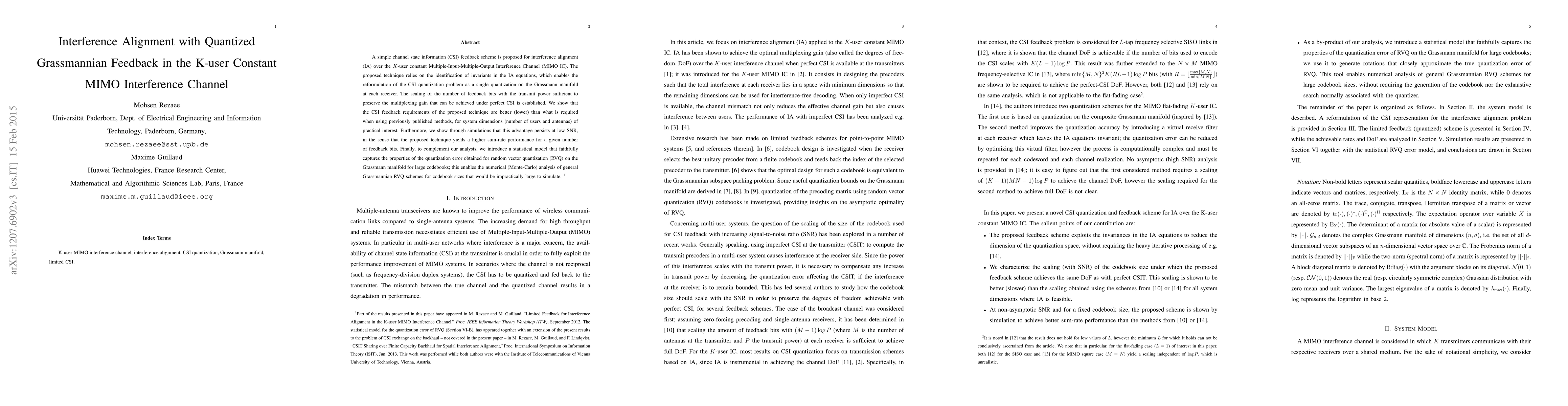 This paper proposes a novel CSI feedback scheme for interference alignment in K-user MIMO channels, utilizing quantized Grassmannian feedback to achieve lower feedback bit requirements compared to existing methods. The technique maintains high sum-rate performance even at low SNR, and a statistical model is introduced for analyzing quantization errors on the Grassmann manifold.