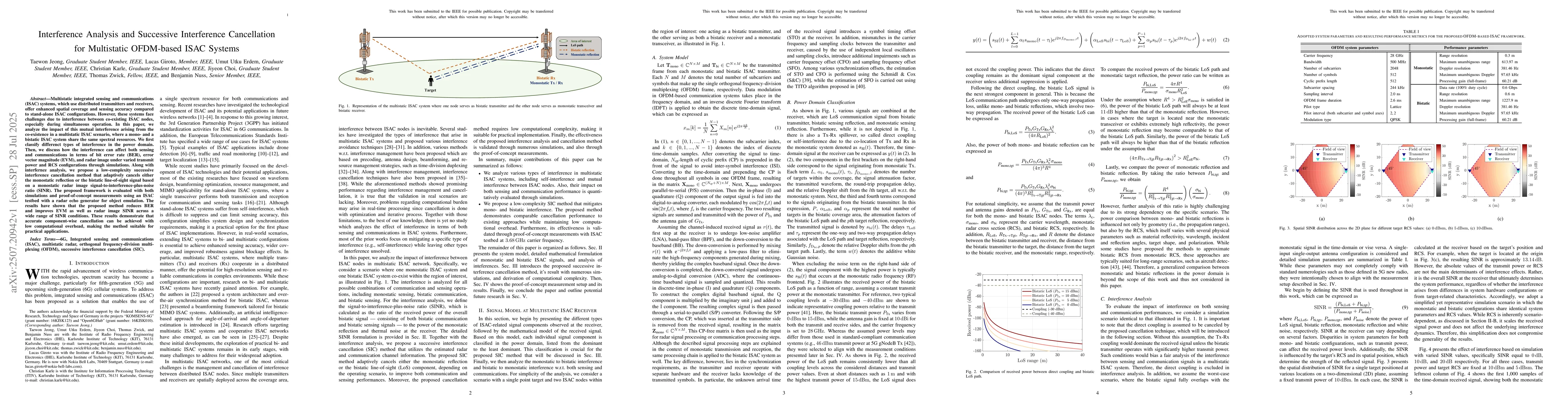 The research analyzes interference in multistatic OFDM-based ISAC systems, classifying interference types, and evaluating their impact on sensing and communication performance through simulations. A low-complexity successive interference cancellation method is proposed, adaptively canceling either monostatic reflection or bistatic LoS signal based on monostatic radar image SINR.