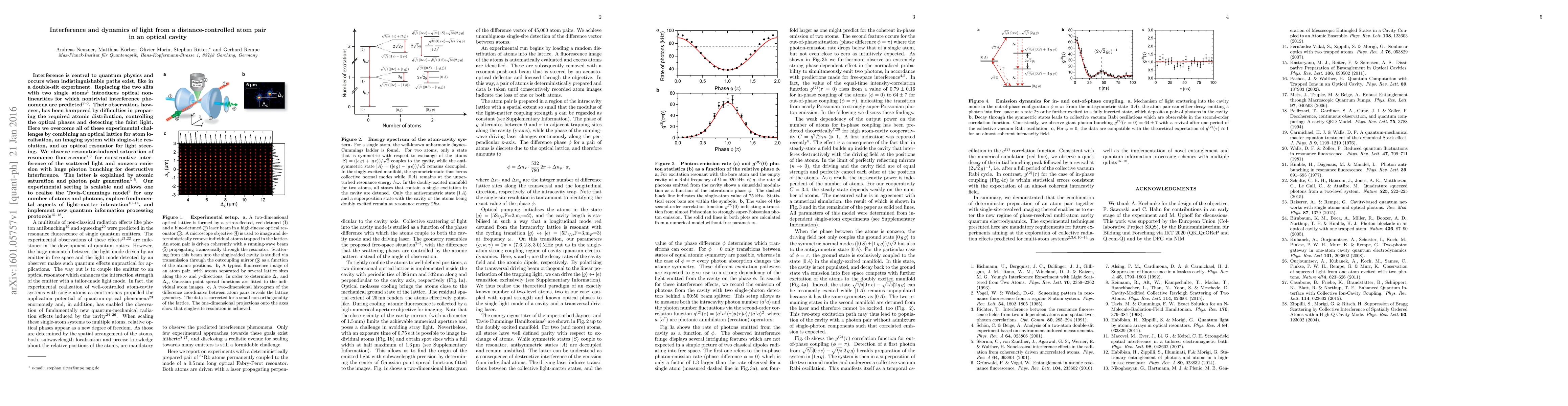 Interference is central to quantum physics and occurs when indistinguishable paths exist, like in a double-slit experiment. Replacing the two slits with two single atoms introduces optical non-linearities for which nontrivial interference phenomena are predicted. Their observation, however, has been hampered by difficulties in preparing the required atomic distribution, controlling the optical phases and detecting the faint light. Here we overcome all of these experimental challenges by combining an optical lattice for atom localisation, an imaging system with single-site resolution, and an optical resonator for light steering. We observe resonator-induced saturation of resonance fluorescence for constructive interference of the scattered light and nonzero emission with huge photon bunching for destructive interference. The latter is explained by atomic saturation and photon pair generation. Our experimental setting is scalable and allows one to realize the Tavis-Cummings model for any number of atoms and photons, explore fundamental aspects of light-matter interaction, and implement new quantum information processing protocols.