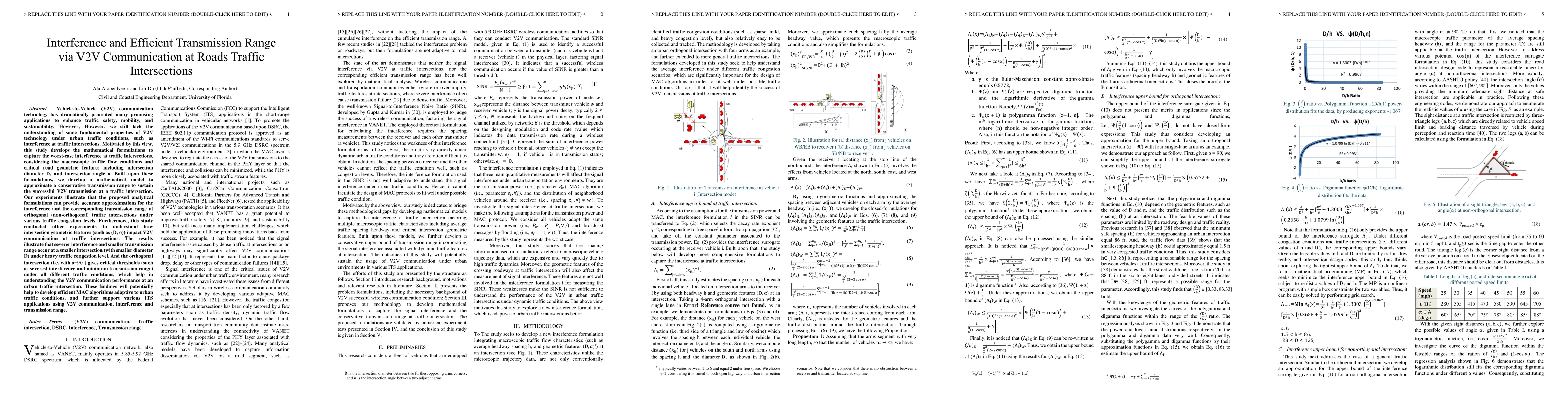 This study develops mathematical models to quantify worst-case interference and determine efficient transmission ranges for V2V communication at urban traffic intersections, considering traffic flow and geometric features. Experimental results show that smaller intersections and higher traffic congestion levels lead to severer interference and reduced transmission ranges, particularly at orthogonal intersections.