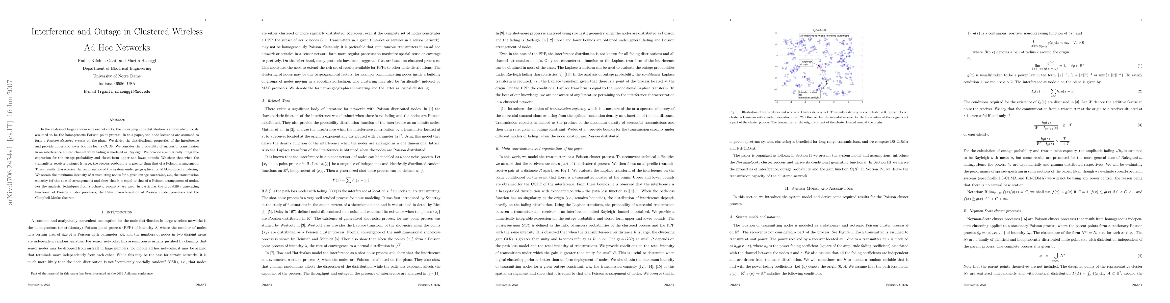 In the analysis of large random wireless networks, the underlying node distribution is almost ubiquitously assumed to be the homogeneous Poisson point process. In this paper, the node locations are assumed to form a Poisson clustered process on the plane. We derive the distributional properties of the interference and provide upper and lower bounds for its CCDF. We consider the probability of successful transmission in an interference limited channel when fading is modeled as Rayleigh. We provide a numerically integrable expression for the outage probability and closed-form upper and lower bounds.We show that when the transmitter-receiver distance is large, the success probability is greater than that of a Poisson arrangement. These results characterize the performance of the system under geographical or MAC-induced clustering. We obtain the maximum intensity of transmitting nodes for a given outage constraint, i.e., the transmission capacity (of this spatial arrangement) and show that it is equal to that of a Poisson arrangement of nodes. For the analysis, techniques from stochastic geometry are used, in particular the probability generating functional of Poisson cluster processes, the Palm characterization of Poisson cluster processes and the Campbell-Mecke theorem.
