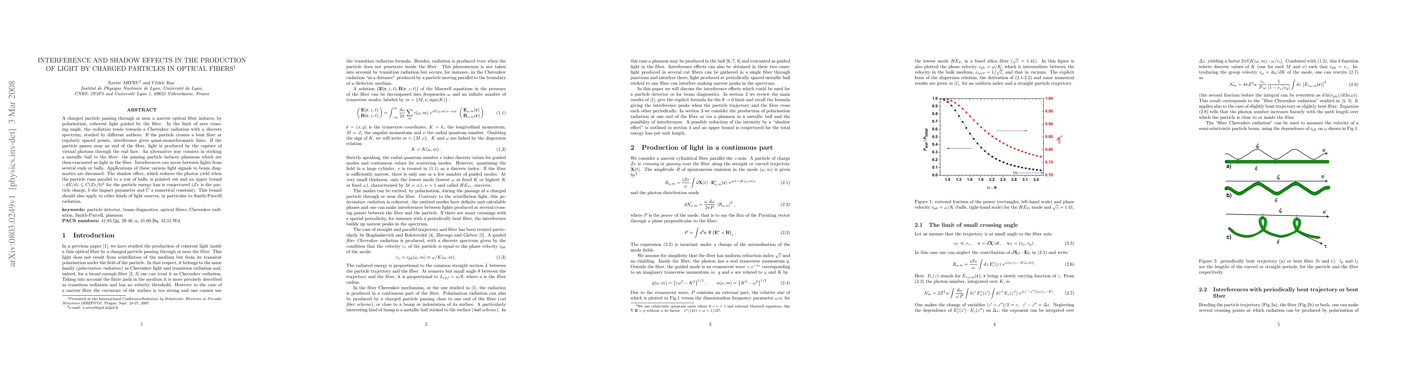 A charged particle passing through or near a narrow optical fiber induces, by polarisation, coherent light guided by the fiber. In the limit of zero crossing angle, the radiation tends towards a Cherenkov radiation with a discrete spectrum, studied by different authors. If the particle crosses a bent fiber at regularly spaced points, interference gives quasi-monochromatic lines. If the particle passes near an end of the fiber, light is produced by the capture of virtual photons through the end face. An alternative way consists in sticking a metallic ball to the fiber: the passing particle induces plasmons which are then evacuated as light in the fiber. Interferences can occur between lights from several ends or balls. Applications of these various light signals to beam diagnostics are discussed. The shadow effect, which reduces the photon yield when the particle runs parallel to a row of balls, is pointed out and an upper bound $-dE/dz\le C(Ze/b)^2$ for the particle energy loss is conjectured ($Ze$ is the particle charge, $b$ the impact parameter and $C$ a numerical constant). This bound should also apply to other kinds of light sources, in particular to Smith-Purcell radiation.