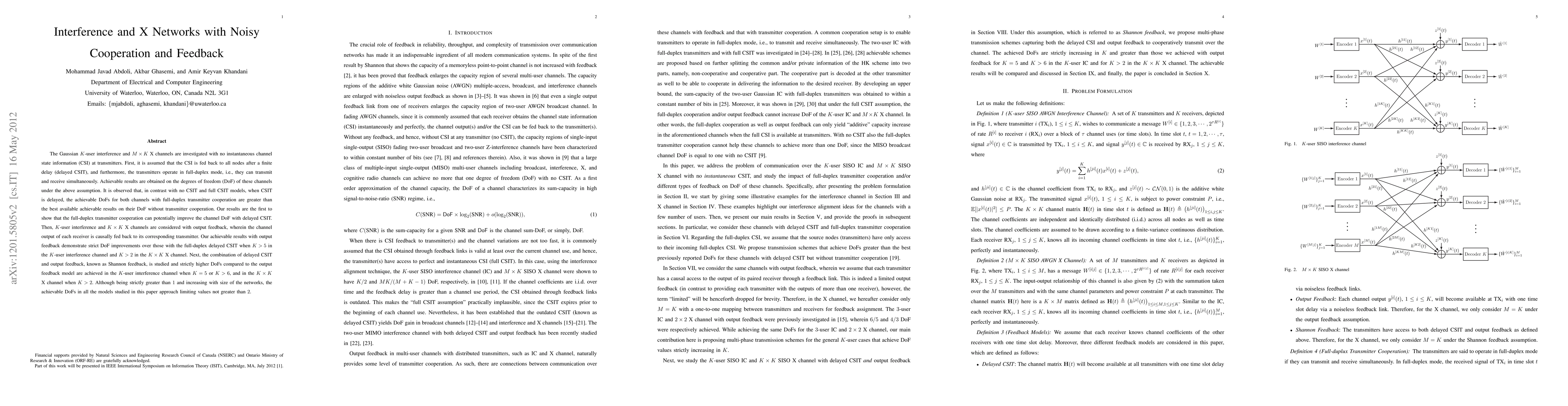 The Gaussian $K$-user interference and $M\times K$ X channels are investigated with no instantaneous channel state information (CSI) at transmitters. First, it is assumed that the CSI is fed back to all nodes after a finite delay (delayed CSIT), and furthermore, the transmitters operate in full-duplex mode, i.e., they can transmit and receive simultaneously. Achievable results are obtained on the degrees of freedom (DoF) of these channels under the above assumption. It is observed that, in contrast with no CSIT and full CSIT models, when CSIT is delayed, the achievable DoFs for both channels with full-duplex transmitter cooperation are greater than the best available achievable results on their DoF without transmitter cooperation. Our results are the first to show that the full-duplex transmitter cooperation can potentially improve the channel DoF with delayed CSIT. Then, $K$-user interference and $K\times K$ X channels are considered with output feedback, wherein the channel output of each receiver is causally fed back to its corresponding transmitter. Our achievable results with output feedback demonstrate strict DoF improvements over those with the full-duplex delayed CSIT when $K>5$ in the $K$-user interference channel and $K>2$ in the $K\times K$ X channel. Next, the combination of delayed CSIT and output feedback, known as Shannon feedback, is studied and strictly higher DoFs compared to the output feedback model are achieved in the $K$-user interference channel when K=5 or $K>6$, and in the $K\times K$ X channel when $K>2$. Although being strictly greater than 1 and increasing with size of the networks, the achievable DoFs in all the models studied in this paper approach limiting values not greater than 2.