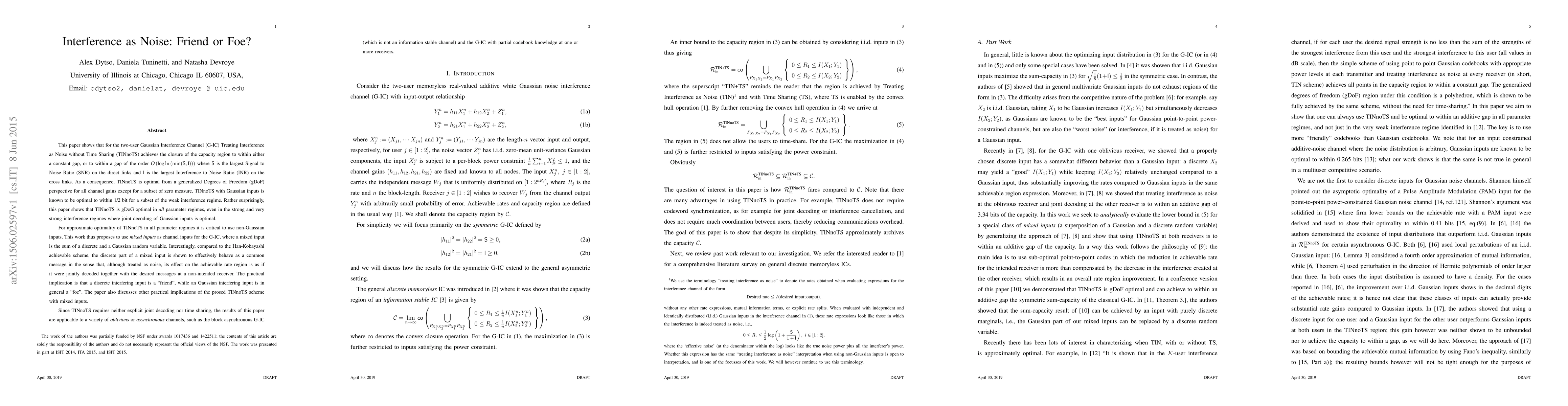 This paper shows that for the two-user Gaussian Interference Channel (G-IC) Treating Interference as Noise without Time Sharing (TINnoTS) achieves the closure of the capacity region to within either a constant gap, or to within a gap of the order O(logln(min(S,I))) where S is the largest Signal to Noise Ratio (SNR) on the direct links and I is the largest Interference to Noise Ratio (INR) on the cross links. As a consequence, TINnoTS is optimal from a generalized Degrees of Freedom (gDoF) perspective for all channel gains except for a subset of zero measure. TINnoTS with Gaussian inputs is known to be optimal to within 1/2 bit for a subset of the weak interference regime. Surprisingly, this paper shows that TINnoTS is gDoG optimal in all parameter regimes, even in the strong and very strong interference regimes where joint decoding of Gaussian inputs is optimal. For approximate optimality of TINnoTS in all parameter regimes it is critical to use non-Gaussian inputs. This work thus proposes to use mixed inputs as channel inputs where a mixed input is the sum of a discrete and a Gaussian random variable. Interestingly, compared to the Han-Kobayashi inner bound, the discrete part of a mixed input is shown to effectively act as a common message in the sense that, although treated as noise, its effect on the achievable rate region is as if it were jointly decoded together with the desired messages at a non-intended receiver. The practical implication is that a discrete interfering input is a 'friend', while a Gaussian interfering input is in general a 'foe'. Since TINnoTS requires neither joint decoding nor time sharing, the results of this paper are applicable to a variety of oblivions or asynchronous channels, such as the block asynchronous G-IC (which is not an information stable) and the G-IC with partial codebook knowledge at one or more receivers.