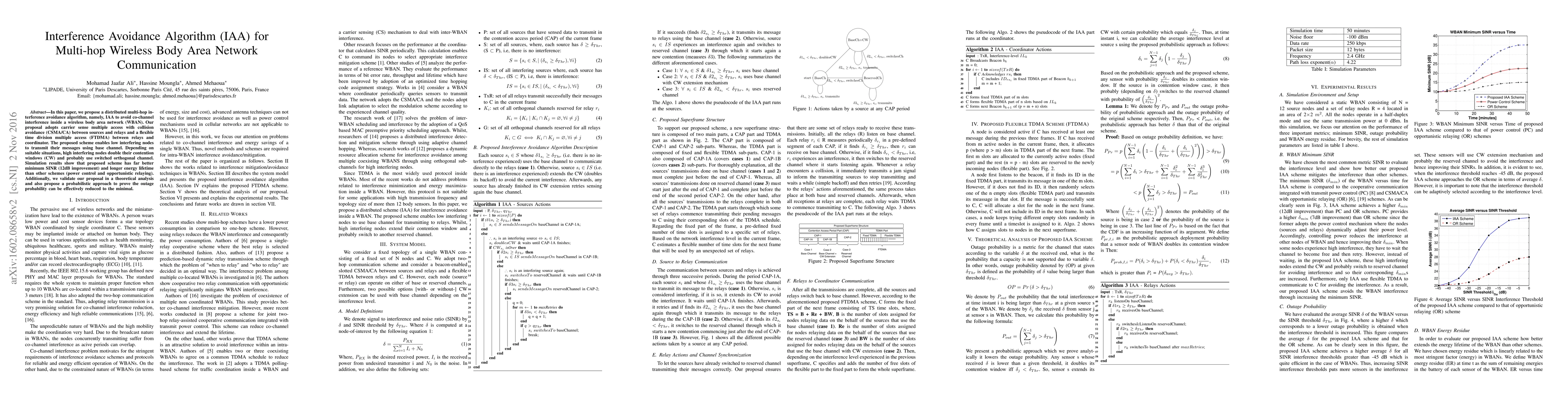 This paper proposes a distributed multi-hop interference avoidance algorithm (IAA) for wireless body area networks (WBANs) to mitigate co-channel interference. The algorithm uses CSMA/CA with flexible time division multiple access (FTDMA) to improve signal-to-interference-plus-noise ratio (SINR) and extend network lifetime, achieving a 12dB SINR improvement and better energy efficiency compared to other methods.
