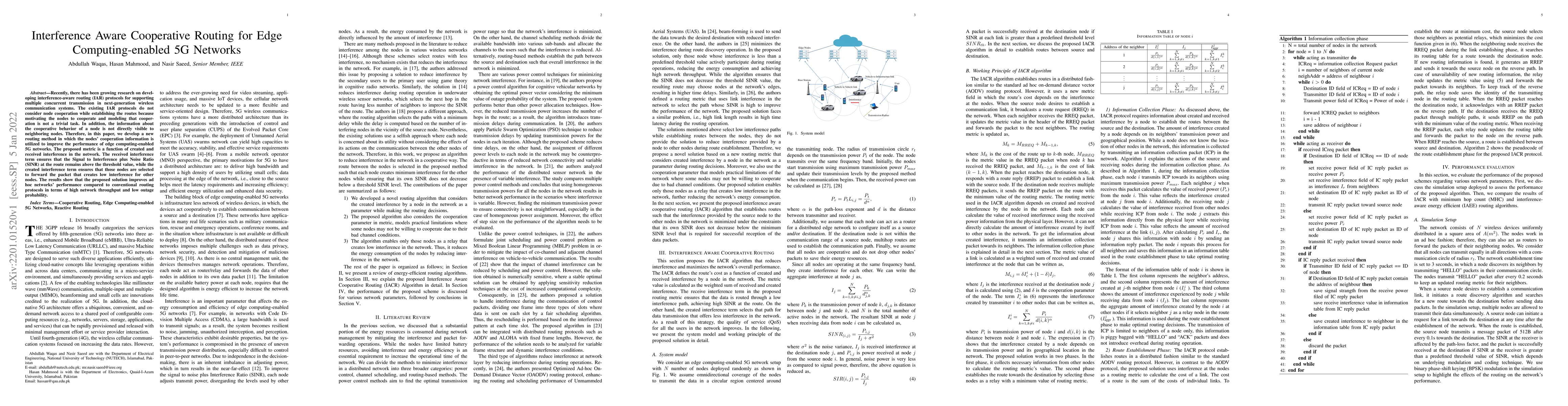 This paper proposes an interference-aware cooperative routing protocol for edge computing-enabled 5G networks, utilizing nodes' cooperation information to enhance network performance. The new metric considers both created and received interference, ensuring high throughput and low outage probability compared to conventional protocols.